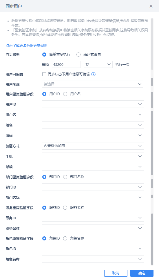 | 仅更新现有用户基本信息,不改变权限等设置 | 如果现有用户不在同步的服务器数据集中,该用户会被删除 如果现有用户在服务器数据集中(用户名相同):
