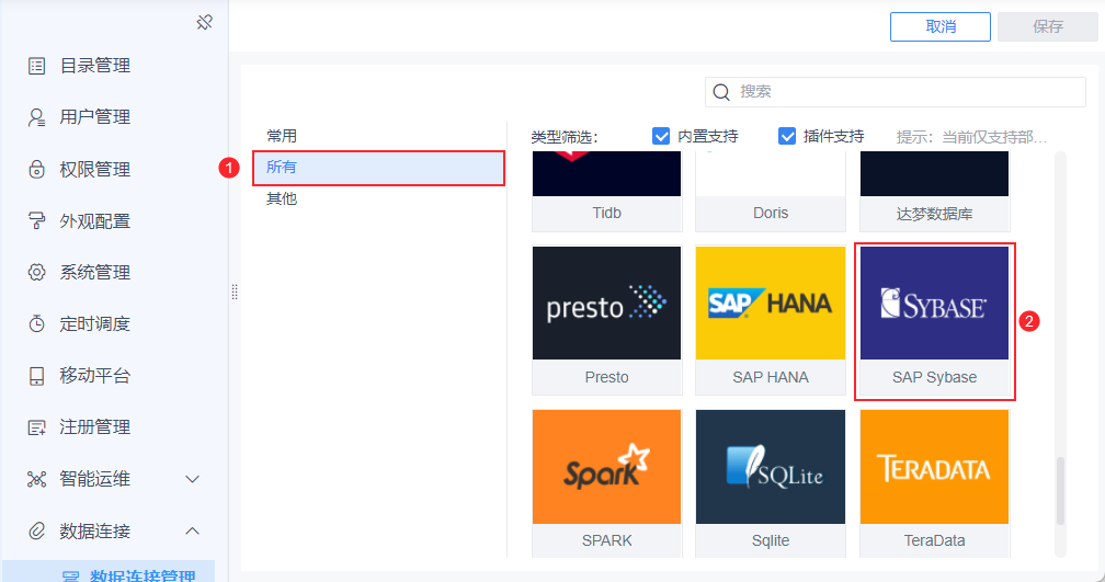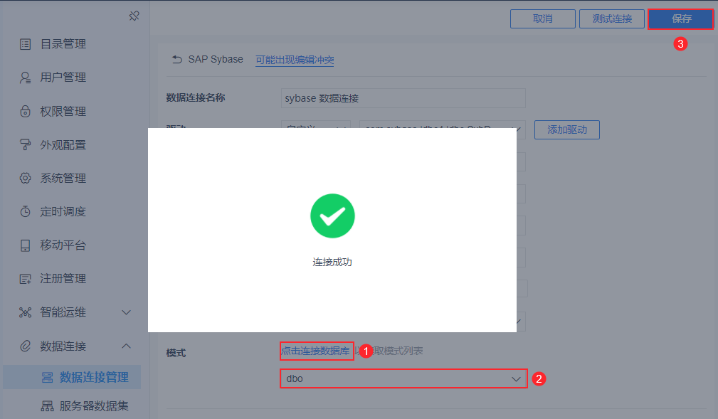 注:如果非管理员用户想要配置数据连接,需要管理员给其分配管理系统下数据连接节点的权限,具体操作请查看 数据连接权限