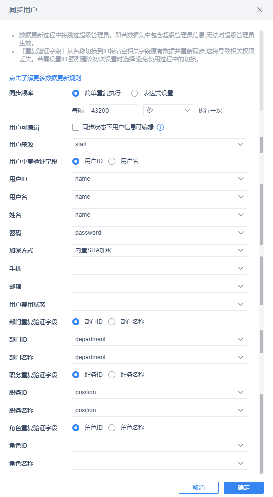 用户名 部门名称 职务名称 角色名称 | 若选择名称,则同步「名称」字段,所在表中的 ID 字段值将由系统随机生成 | 如果修改数据集中某用户的用户名,平台中用户名也会跟着修改,所对应用户 ID 由系统随机生成,新用户名的用户会丢失之前单独为该用户配置的权限。同理,部门,职位,角色则会丢失继承自部门/职务/角色的权限 | 若重复验证字段选择职务名称,那么数据源中名称相同但 ID 不同的职务会作为一个职务看待,若同一部门下有两个名称为「财务」的不同职务,会直接显示为同一个职务,其下用户也会合并显示 但如果两个「财务」属于不同部门,则虽算作一个职务,但因部门-职务关系的不同,其下用户不会合并在一起显示。用户,部门,角色同理 |