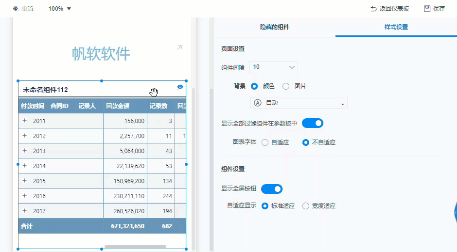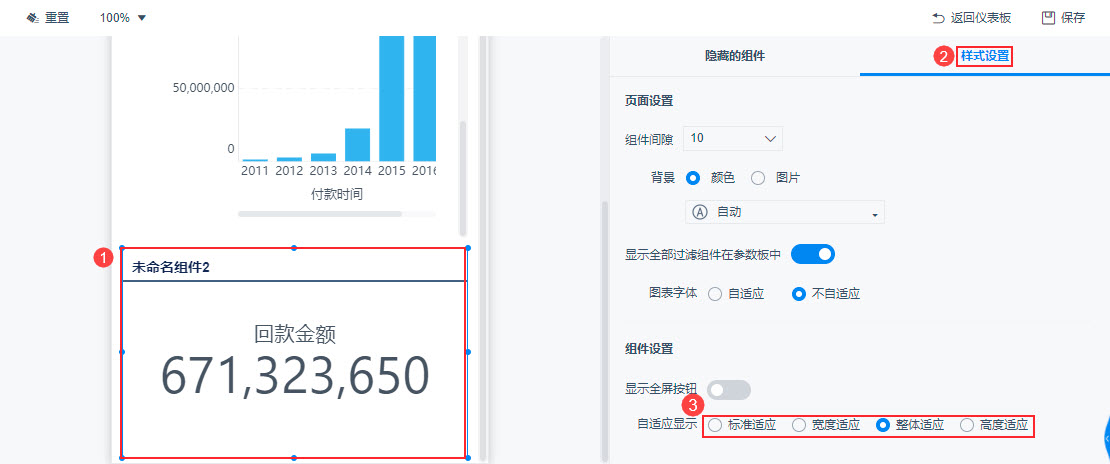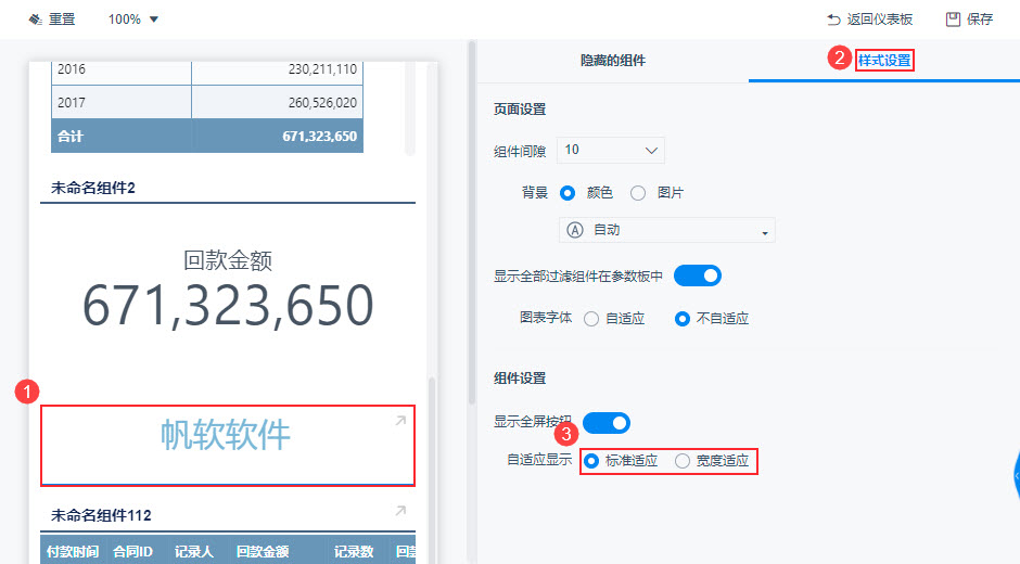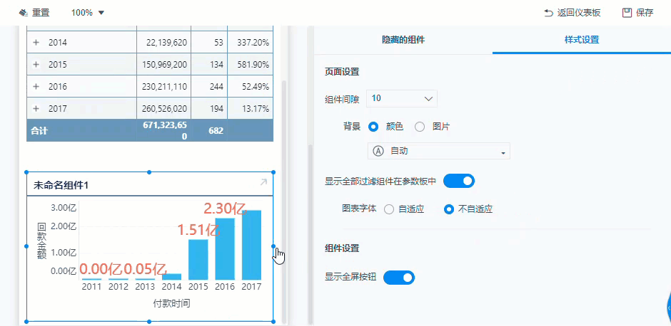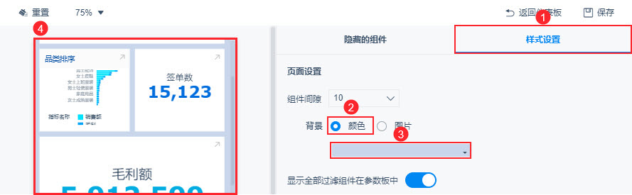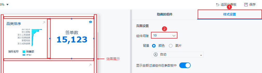 在「样式设置」tab 下,可以对仪表板「页面设置」样式、对「组件设置」样式。