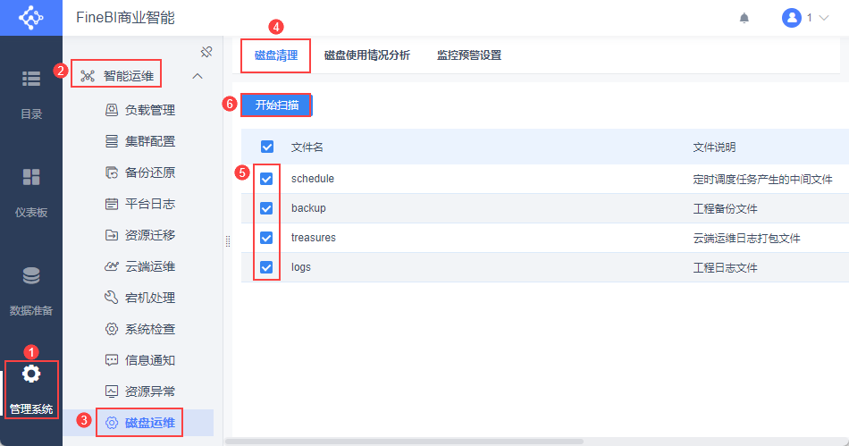 管理员登录数据决策系统,点击「管理系统>智能运维>磁盘运维>磁盘清理」。