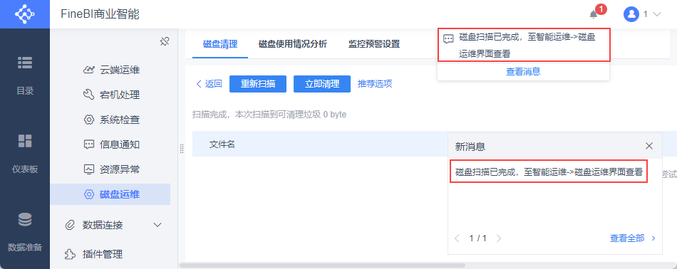扫描完成后,平台推送消息给超级管理员,消息内容为「磁盘扫描已完成,至智能运维>磁盘运维界面查看」。如下图所示: