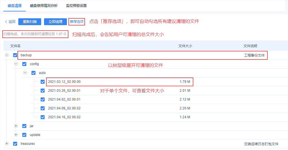 备份文件 | 1)文件路径: 若自定义备份文件路径,则扫描自定义路径 谨慎清理 | 不支持自动清理 | 文件层级直接展示到具体的日期(日级别),用户手动选择需要清理的范围即可 推荐清理3个月之外的文件 3个月之内的文件不显示