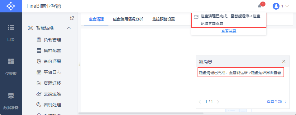 清理完成后,平台推送消息给超级管理员,消息内容为「磁盘清理已完成,至智能运维>磁盘运维界面查看」。如下图所示: