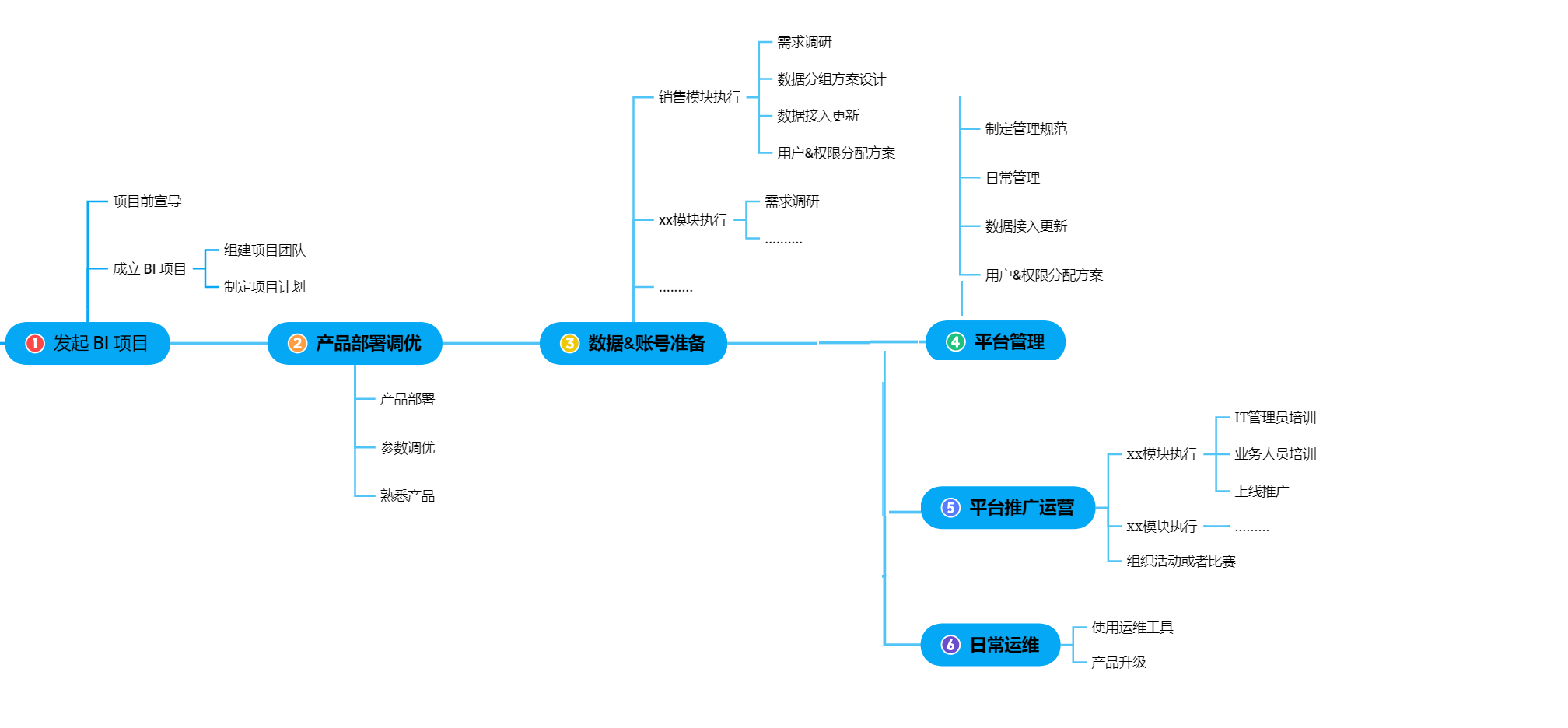 例如需要在企业内部进行 BI 的前 3 个部门推广,来确认 BI 真正能够带来使用价值;当将前几个试点部门推广成功后,其他部门可直接套用推广过程进行赋能学习即可;