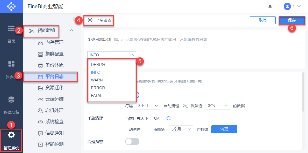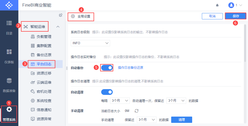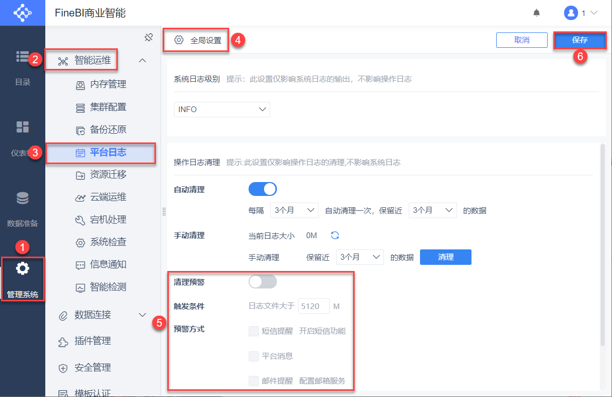 超级管理员登录数据决策系统,点击「管理系统>智能运维>平台日志」,点击「全局设置」,可对操作日志文件进行清理,可以设置「自动清理」和「手动清理」。
