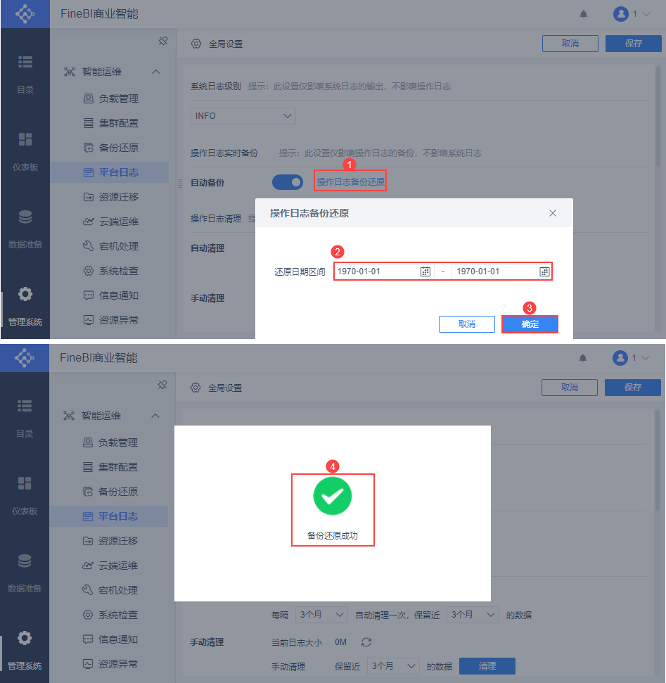 点击「操作日志备份还原」按钮,跳出日期选择框。选择需要还原的操作日志日期区间,点击「确定」。