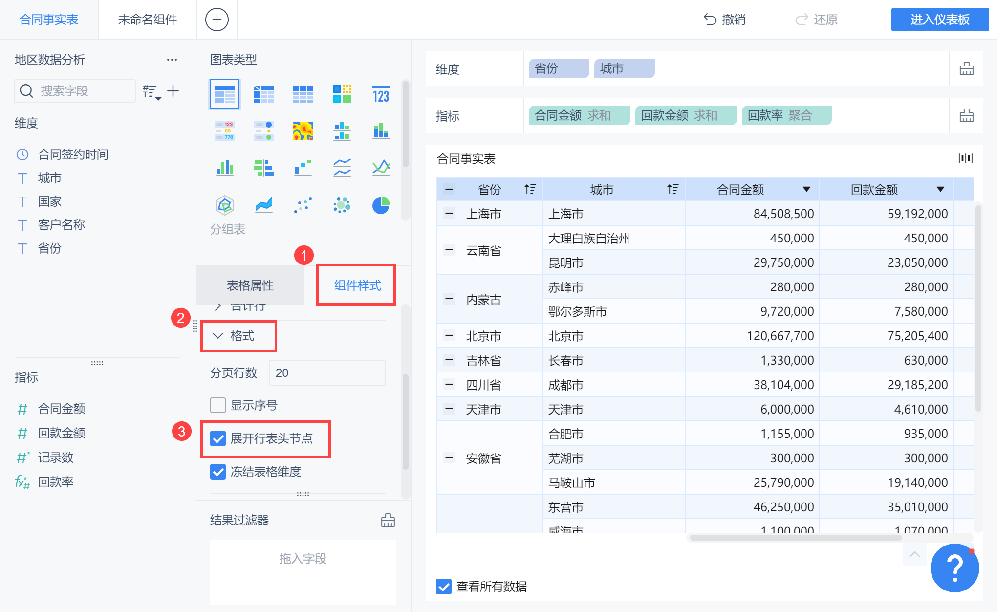 2)在图表类型中选择「分组表」,为行维度拖入待分析维度区域的「省份」、「城市」字段,为列维度拖入待分析维度区域的「合同金额」、「回款金额」字段,并在「组件样式」中,「展开行表头节点」,如下图所示: