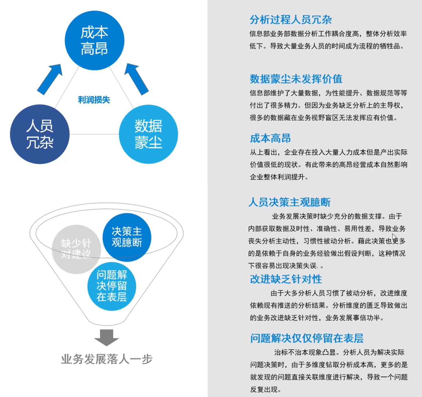 也就是要明确当前企业利用数据时存在哪些问题?业务人员、IT人员、领导都有哪些对数据的需求?当前在哪些方面不满足?当前流程有哪些效率低下的问题?这些都是要在项目前进行调研获取到的信息。