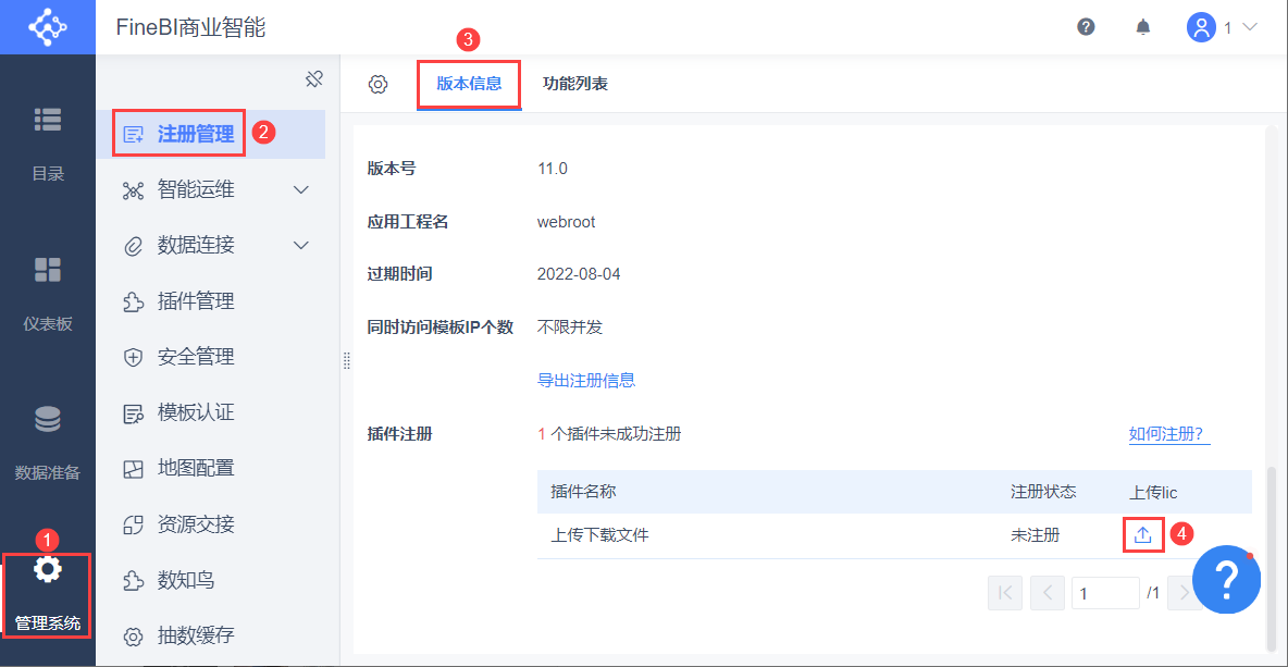 管理员登录FineBI系统,点击「管理系统>注册管理>版本信息」,点击对应插件后方的「上传」按钮,上传 3.4 节下载的 license 文件即可。