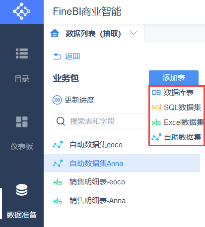 注:添加数据库表、SQL数据集需要有对应数据连接的使用权限,详情参见:数据连接控制