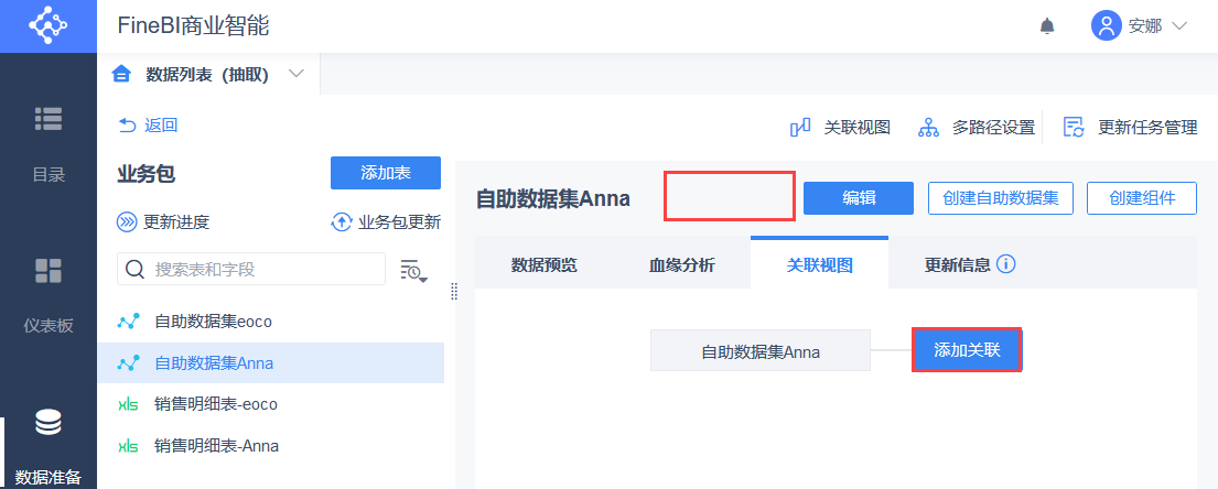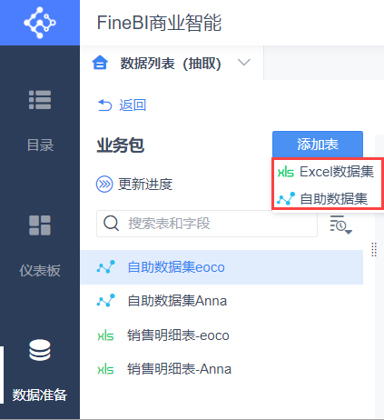 3)在有 编辑权限 的业务包下,也能添加自助数据集EXCEL数据集,如下图所示: