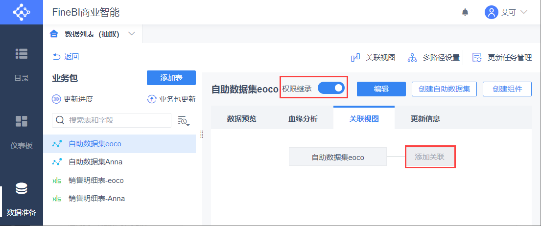 4)数据分析用户创建的自助数据集默认继承权限,即与使用的基础表权限一致,且只有自助数据集创建者和超级管理员有权限继承的配置权限,权限继承配置具体请参见 权限继承 ,不支持建立关联,如下图所示: