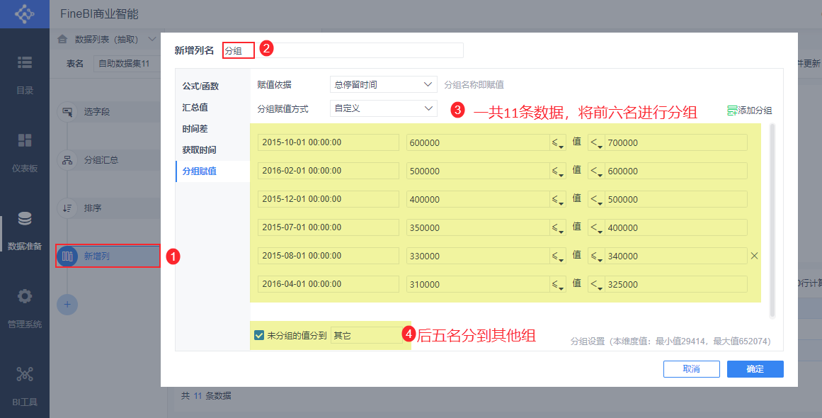 5)新增列,选择「分组赋值」,设置想要展示的分组,如下图所示: