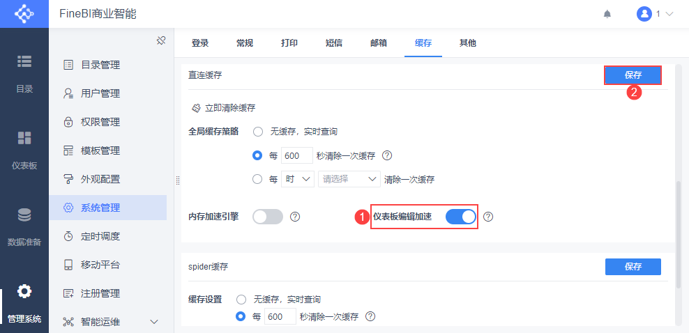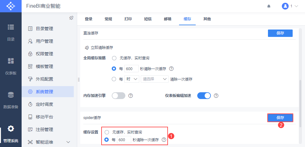 管理员登录数据决策系统,点击「管理系统>系统管理>缓存」,可进行「直连缓存」和「spider缓存」设置。
