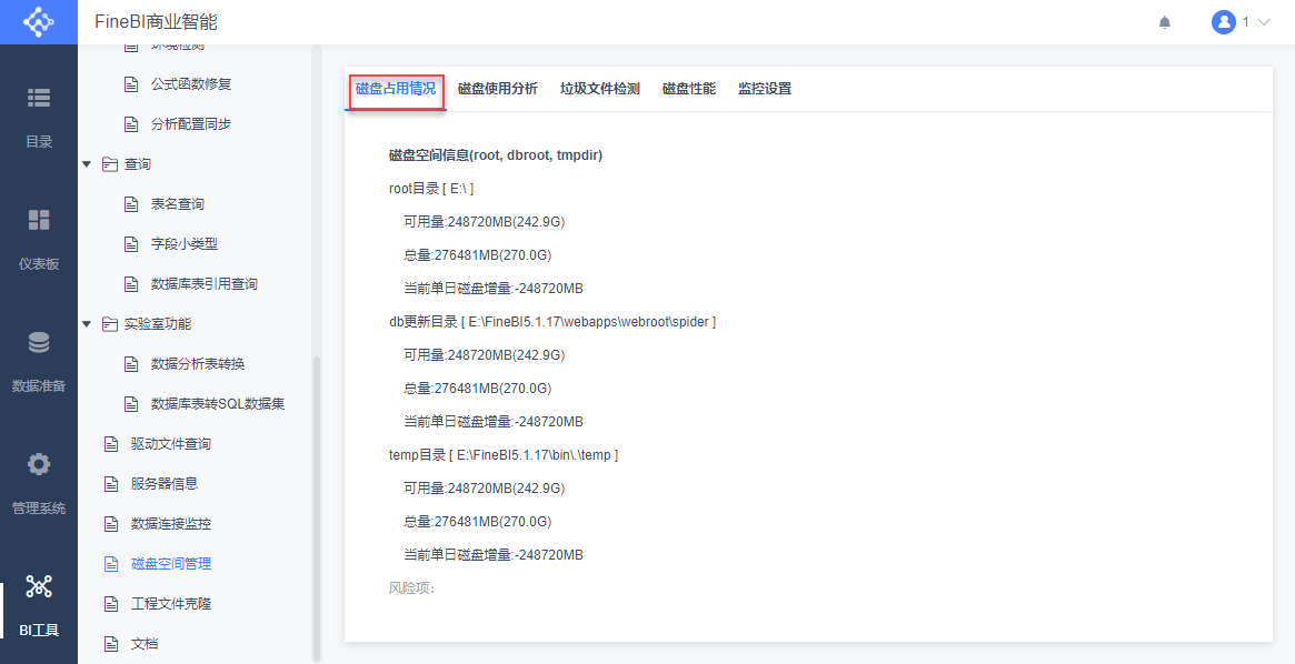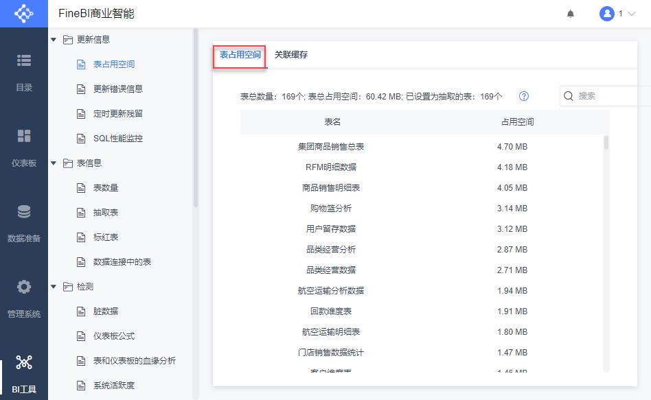 显示当前 BI 系统下,所有表在成功更新后所占用的磁盘空间一览。如下图所示: