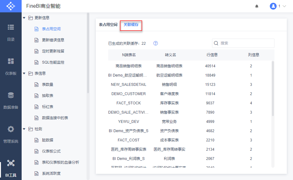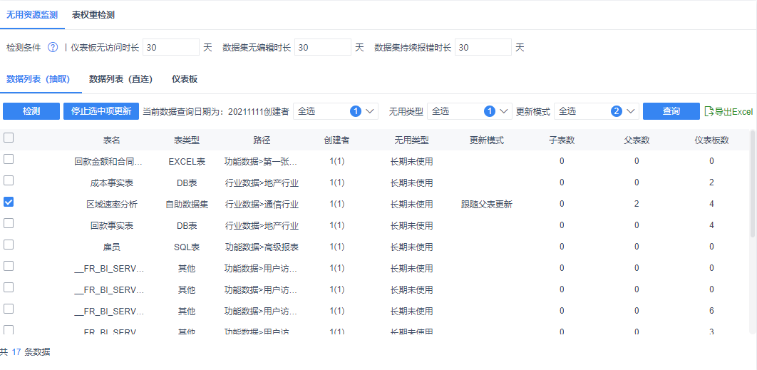 用户可对抽取数据、直连数据、仪表板分别进行检测、查询。可根据创建者、无用类型、更新模式等条件进行筛选。可勾选相关表停止更新。