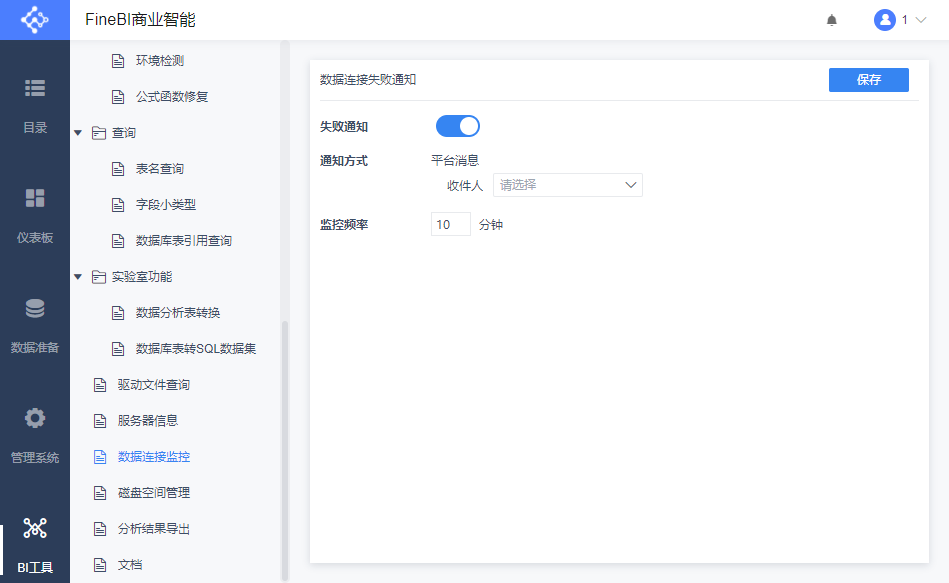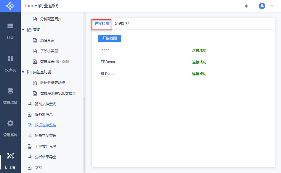 定时检测数据连接是否处于连接成功状态。时间间隔支持设置,默认时间间隔为10分钟,10分钟即最小时间间隔。 检测范围:「数据连接管理」下的所有连接