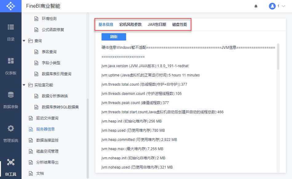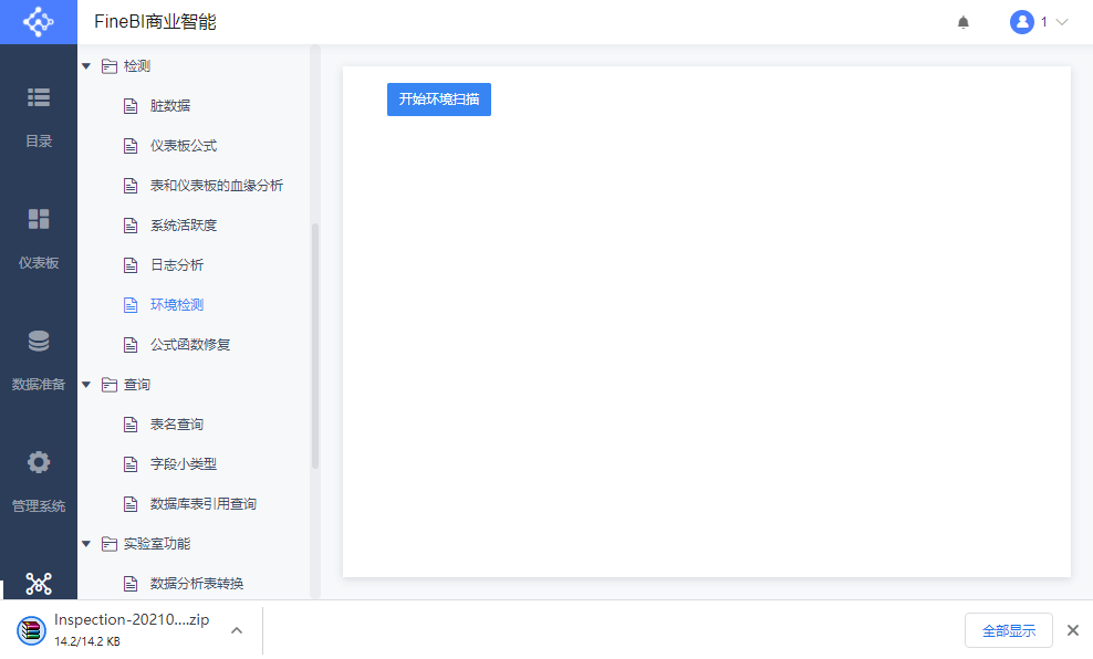 环境检查功能,检测内容包括:系统环境信息、BI工程信息、jar包信息、工程目录文件、集群节点信息、抽取实时各类型表数量。