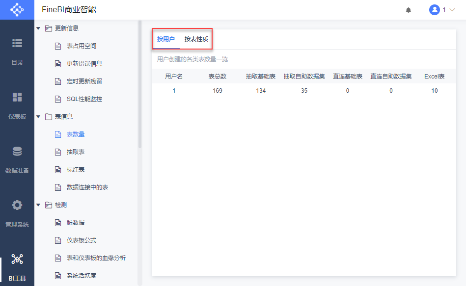 列举每个用户创建的各类(抽取、直连、基础表、自助分析)表数量,以及各类表数量分别汇总。