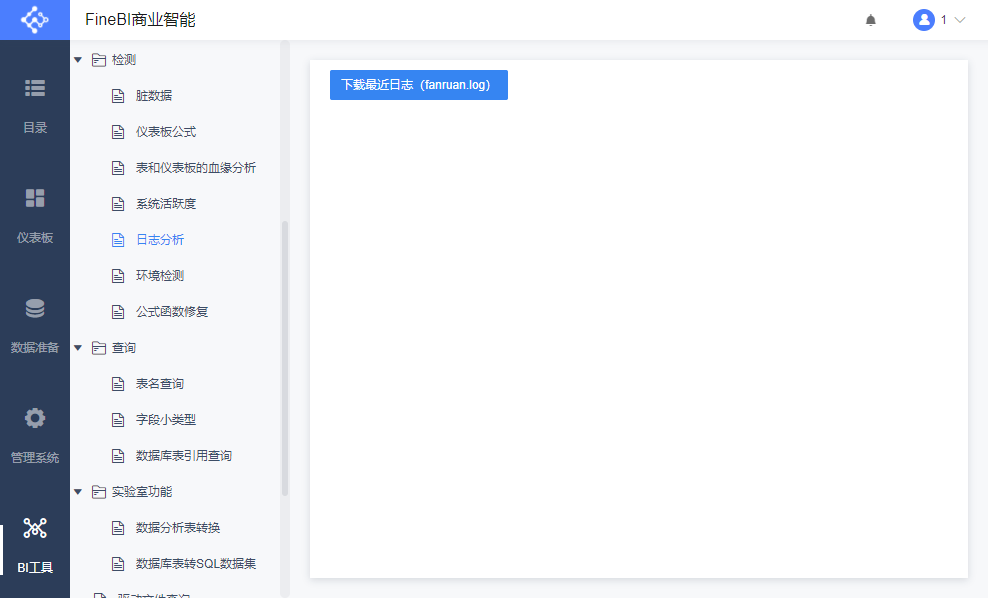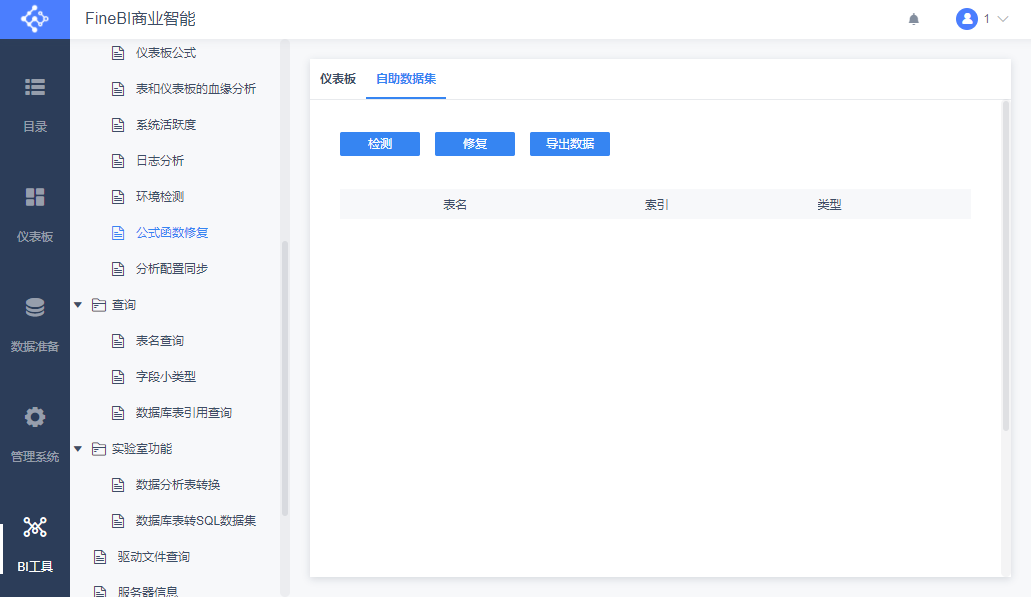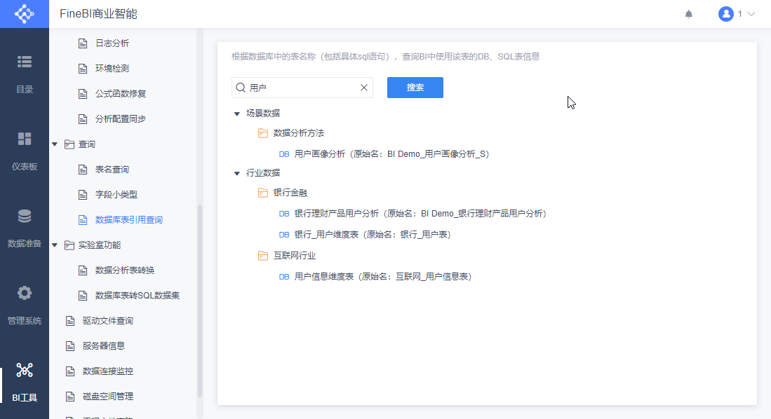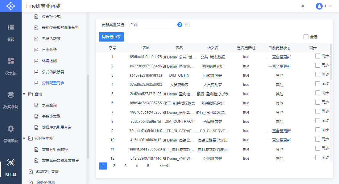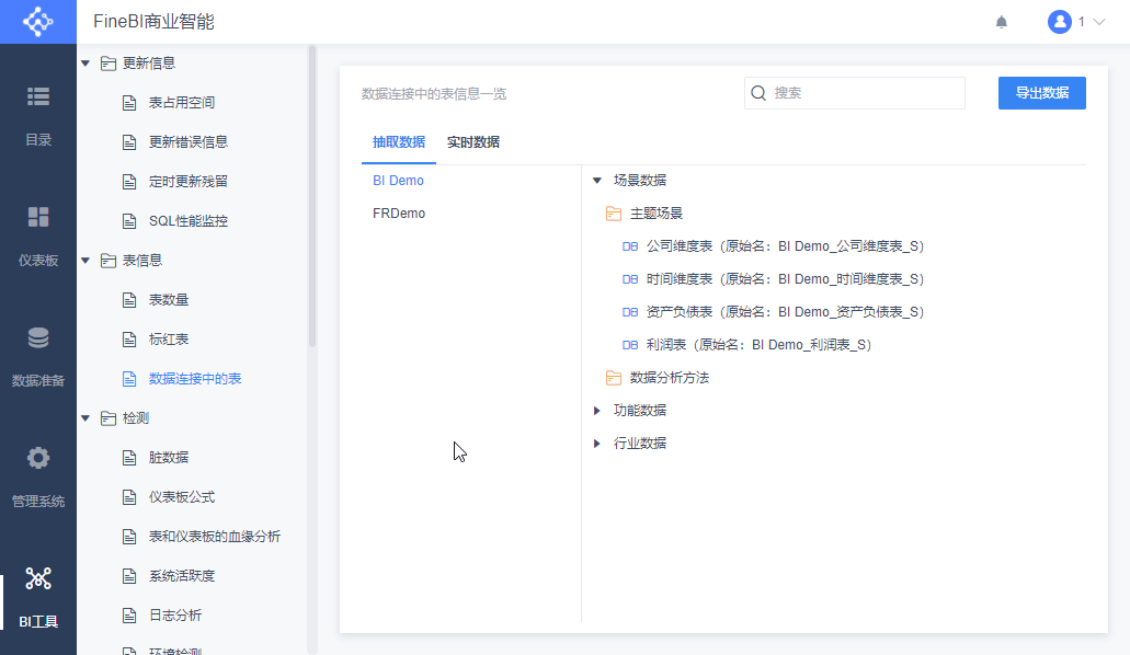| 5.1.17 | 1)「数据库表转SQL数据集」新增支持抽数类型的db表转换为SQL表 2)「分析结果导出」功能分散到各个分析项中,不统一导出。分析项包括:表占用空间、更新失败表、无需抽取表、抽取表列表、关联缓存、按用户显示表数量、标红表、数据连接中的表、仪表板公式、按表性质显示表数量、公式函数修复。 3)新增「工程文件克隆」功能 |