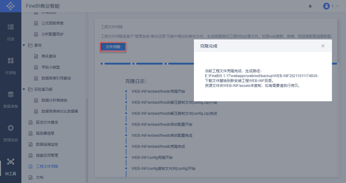 工程文件克隆是基于「管理系统-备份还原」功能中最近的备份文件,生成搭建测试工程时的必要文件。