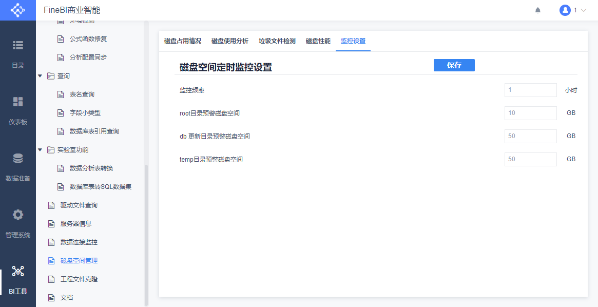 支持设置 root 目录,db 更新目录和 temp 目录预警磁盘空间,若触发预警,则通过数据决策系统推送给管理员。