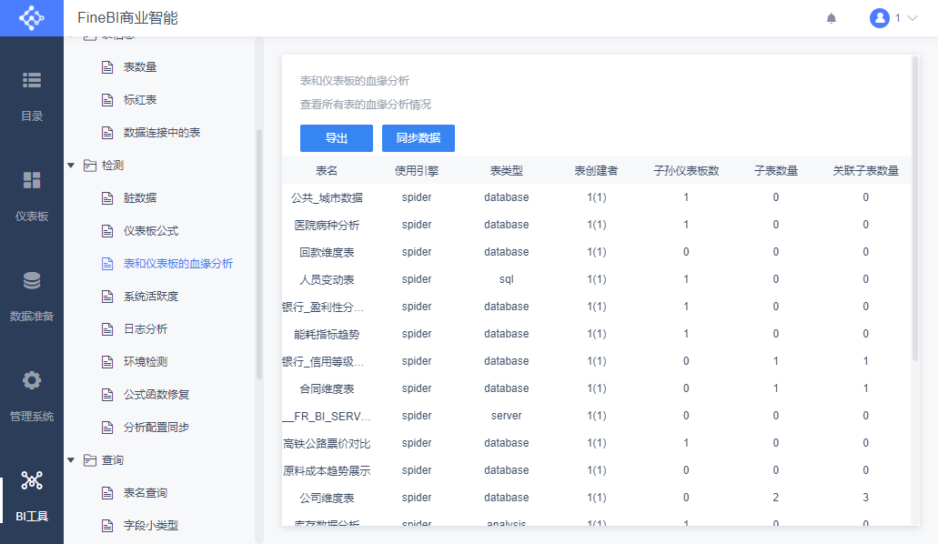 管理员在「BI工具」中的「仪表板的血缘分析」功能中,执行一下同步数据,logdb 中的 fine_relationship 表会出现相关内容,记录数据表仪表板的血缘关系数据。