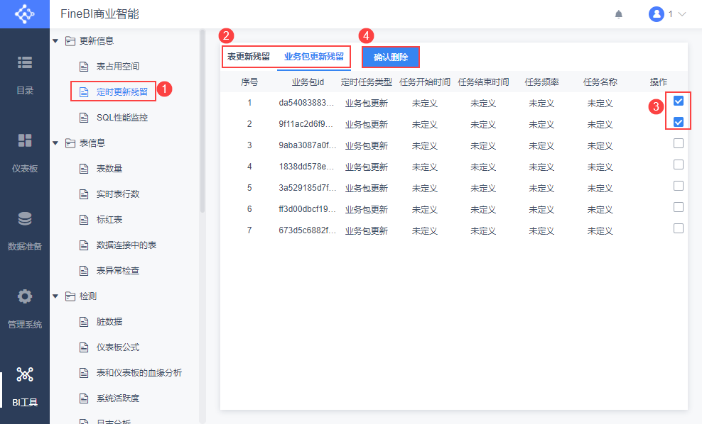 若版本升级后,数据表/业务包被删除了,仍有残留的定时更新任务,可通过该功能删除。