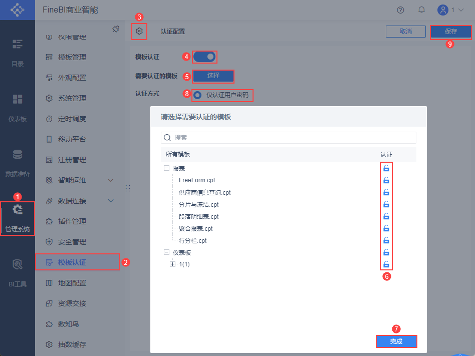 管理员登录FineBI系统,选择「管理系统>模板认证>认证配置」,开启「模板认证」。