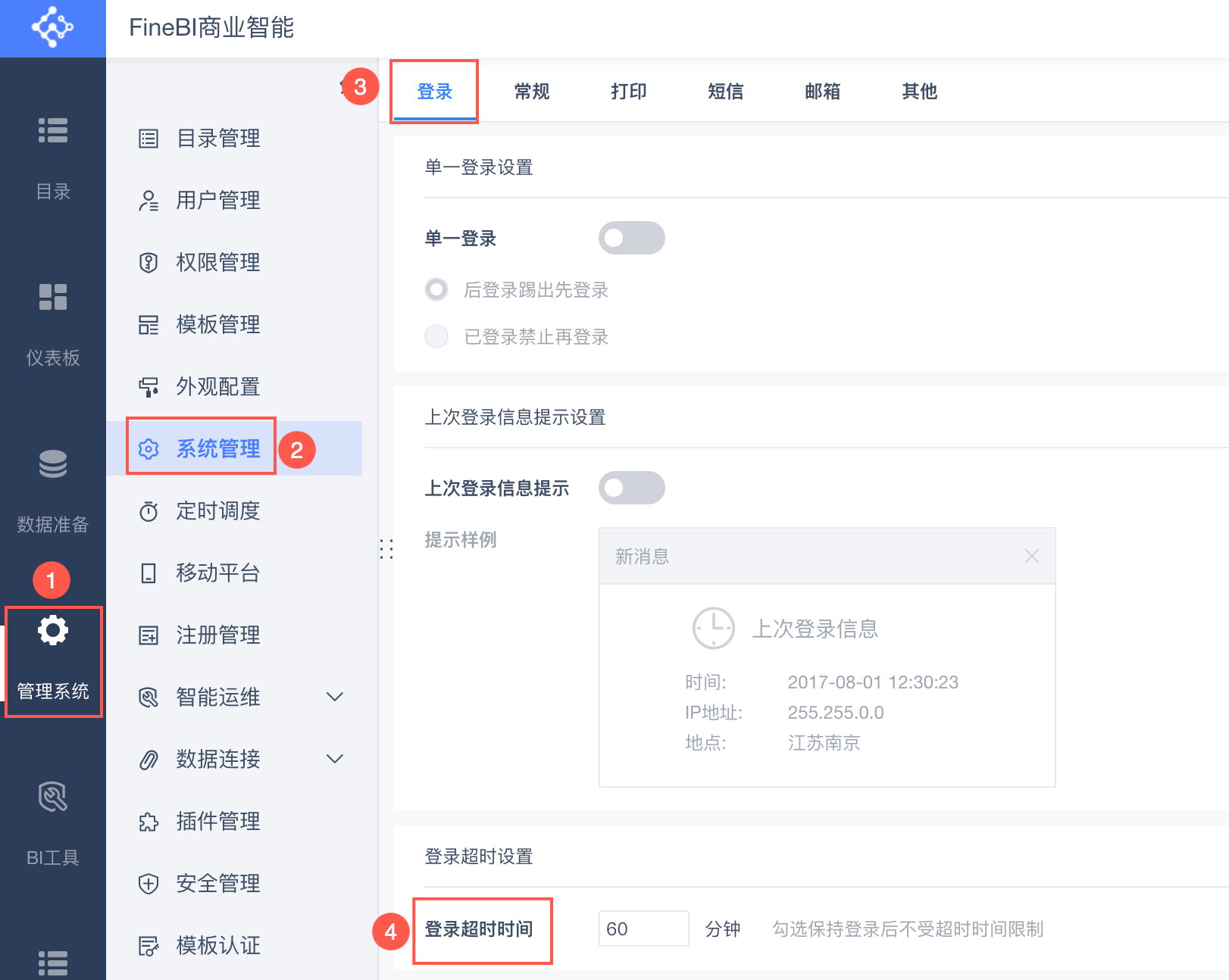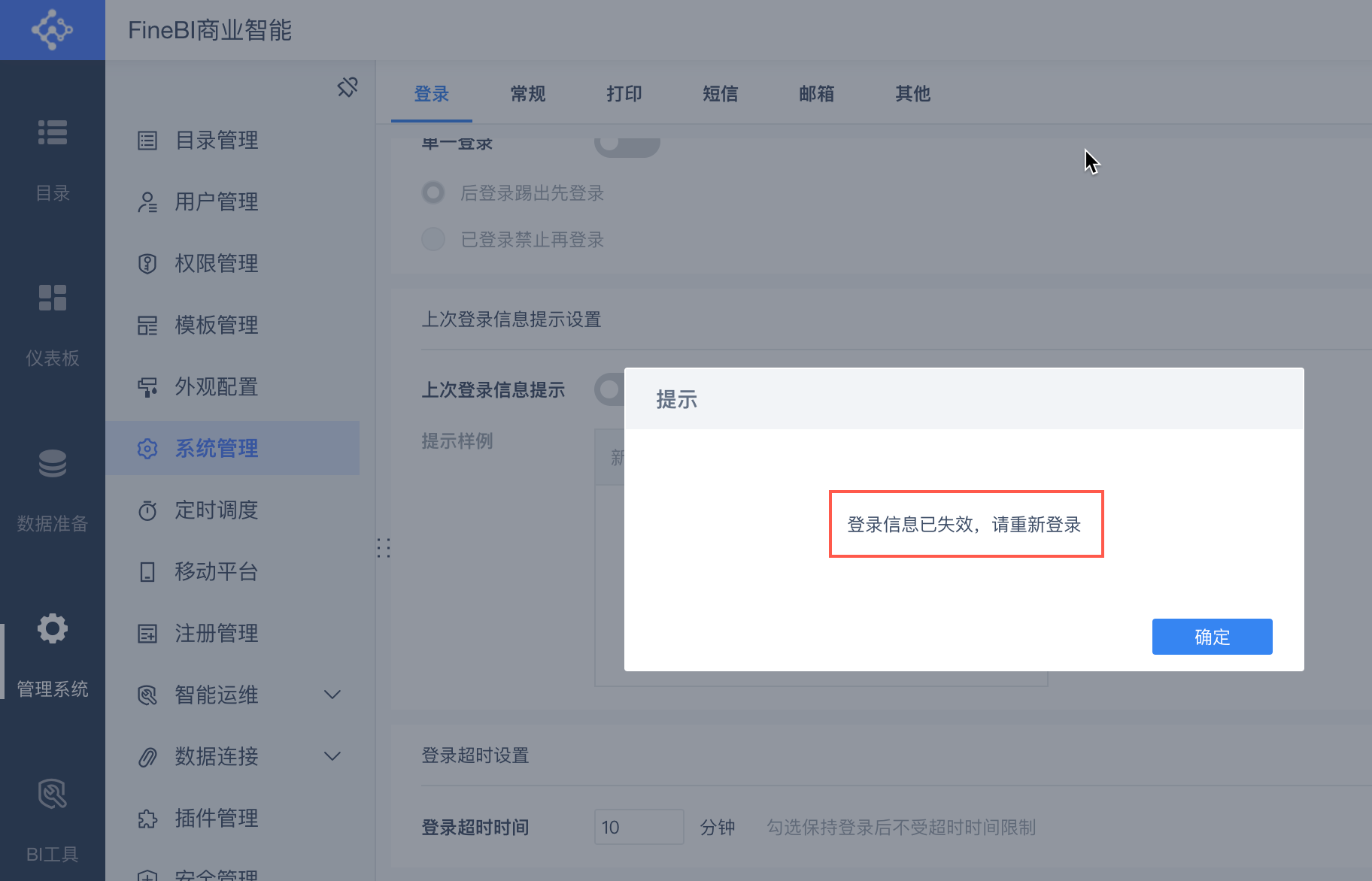 以管理员身份进入数据决策系统,点击「管理系统>系统管理>登录」,可设置「登录超时时间」,如下图所示: