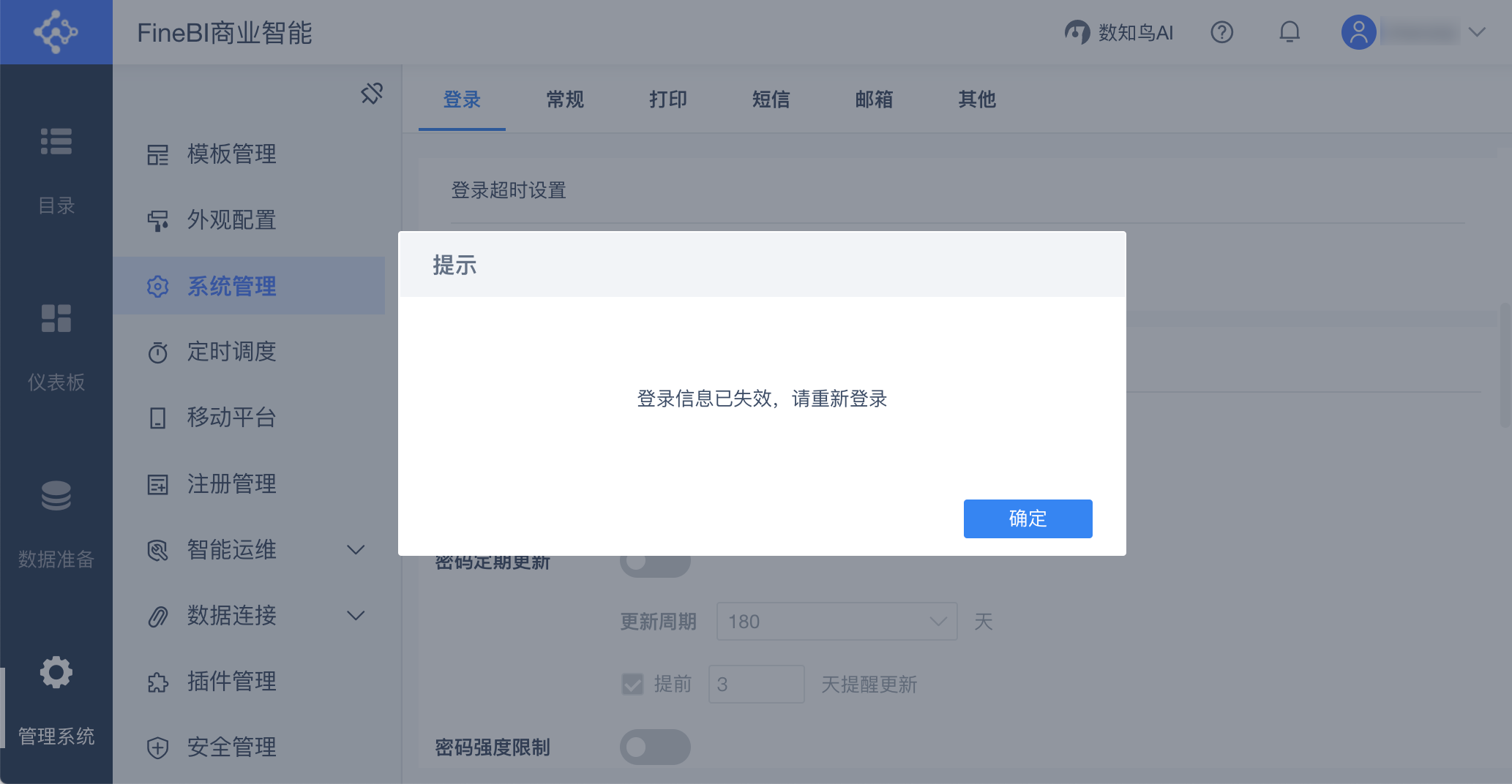 根据设置的登录超时时间,比如设置为 10 分钟,那么打开平台和预览模板(开启了 模板认证)时,当停止操作超过 10 分钟,就提示「登录信息已失效,请重新登录」,如下图所示: