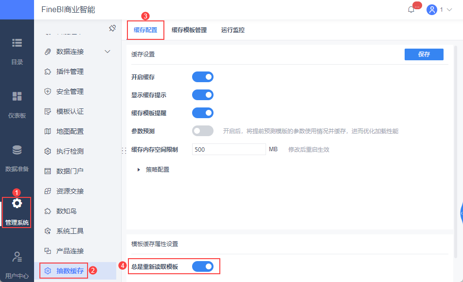 开启「主动缓存」时,需要在「管理系统>抽数缓存>缓存配置」下,开启「总是重新读取模板」,如下图所示: