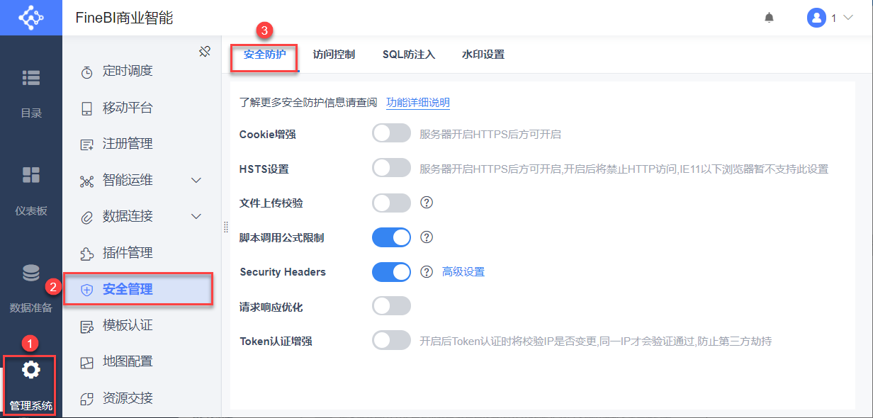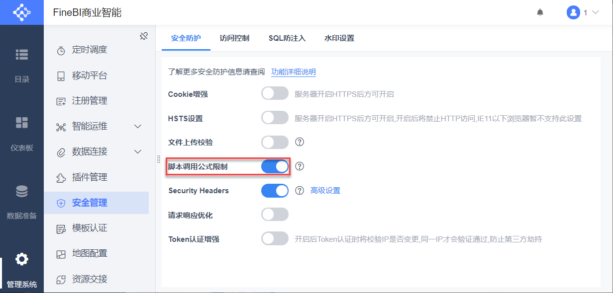 管理员登录 FineBI 系统,点击「管理系统>安全管理>安全防护」,即可开启「脚本调用公式限制」,如下图所示:
