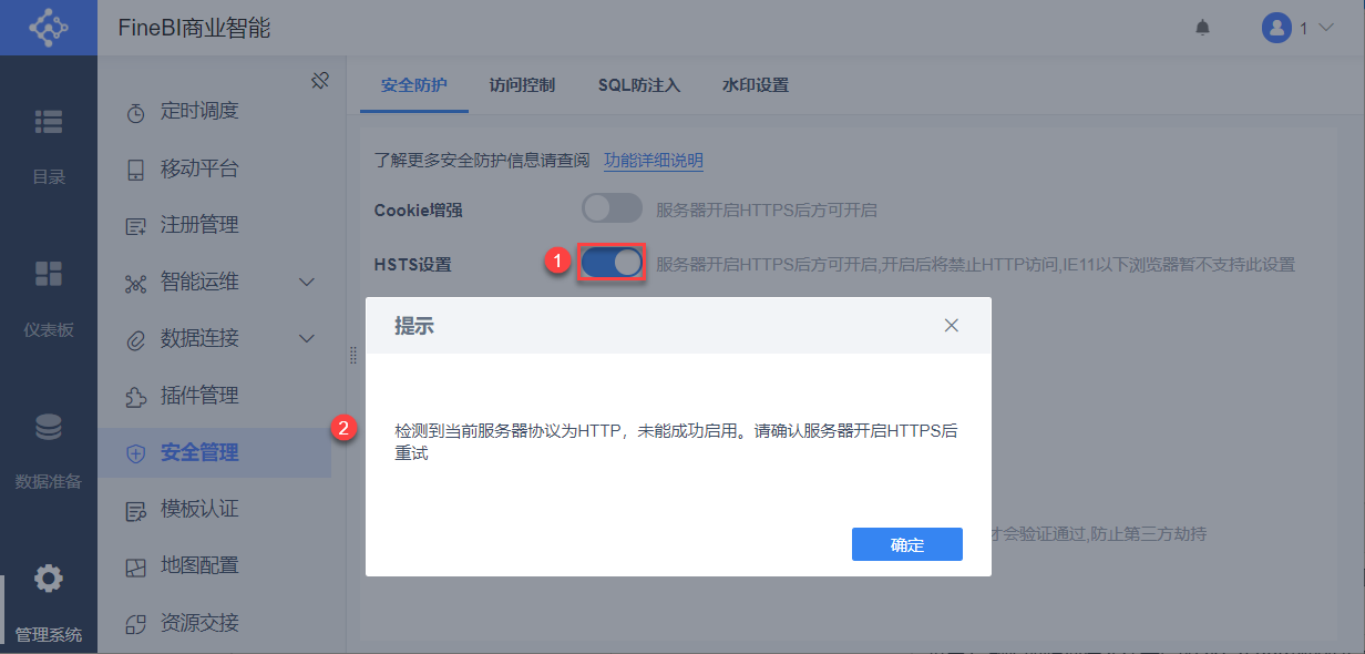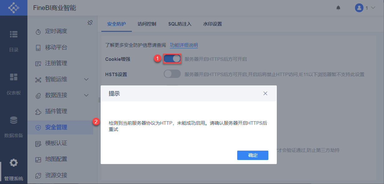 检测到当前服务器协议为 HTTP 时,弹窗提示:检测到当前服务器协议为 HTTP,未能成功启用。请确认服务器开启 HTTPS 后重试,并开启失败。