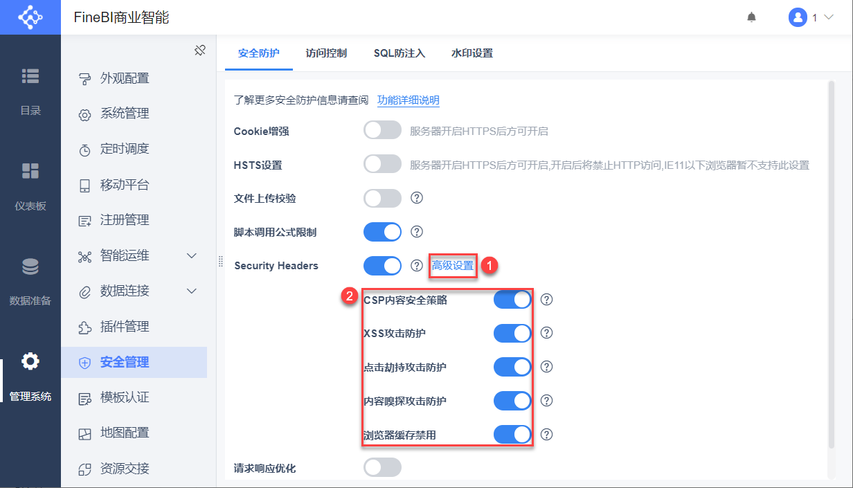 管理员登录 FineBI 系统,点击「管理系统>安全管理>安全防护」,开启「Security Headers 」功能。点击「高级设置」,即可开启「XSS攻击防护」。如下图所示: