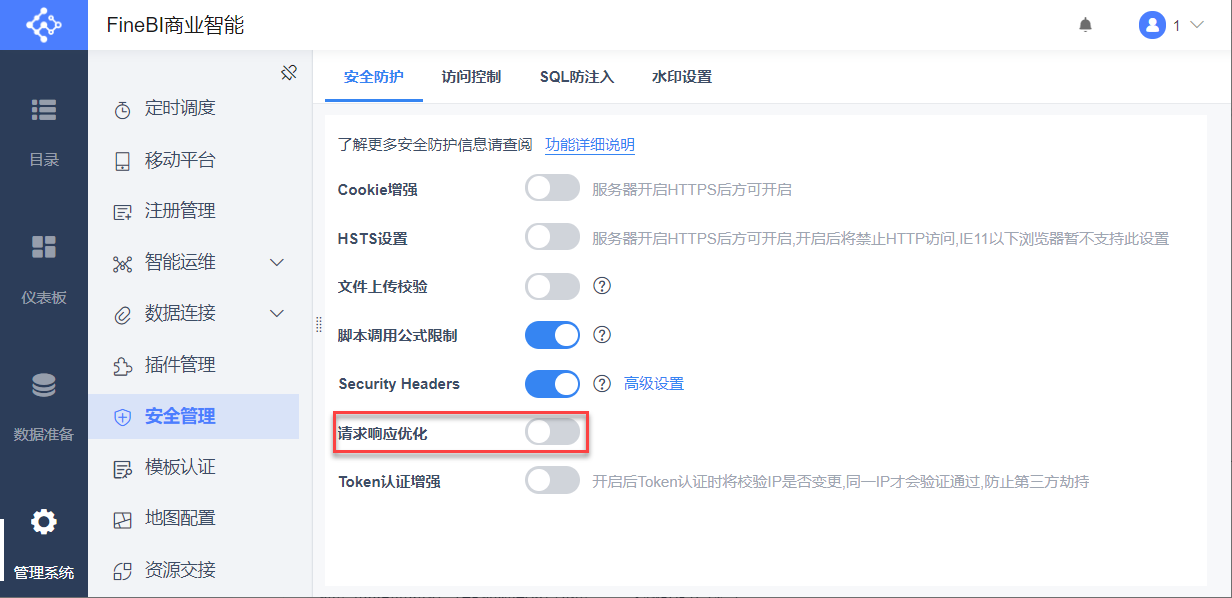 管理员登录 FineBI 系统,点击「管理系统>安全管理>安全防护」,即可开启「请求响应优化」,如下图所示: