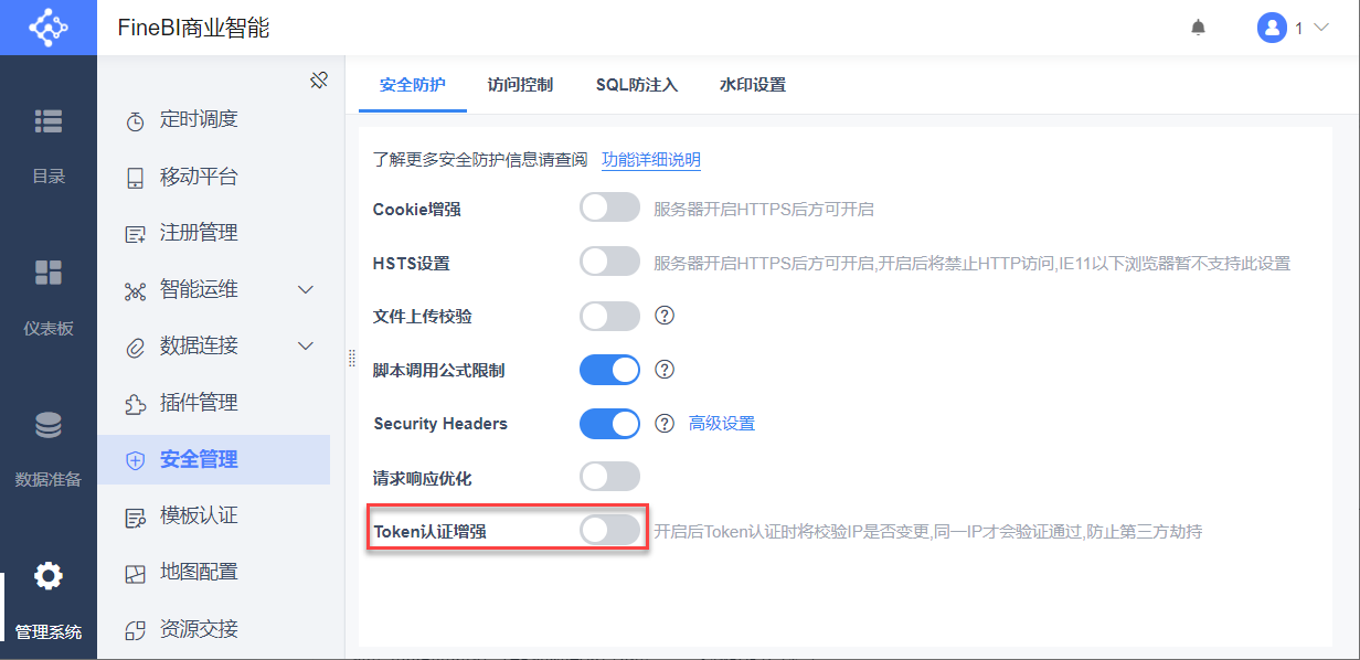 管理员登录 FineBI 系统,点击「管理系统>安全管理>安全防护」,即可开启「Token认证增强」,如下图所示:
