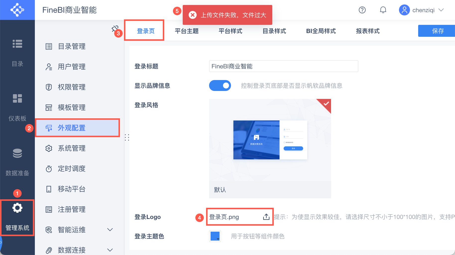 在「管理系统>外观配置」中,上传超过 20M 的图片,弹出提示框「上传文件失败,文件过大」,文件上传失败。如下图所示: