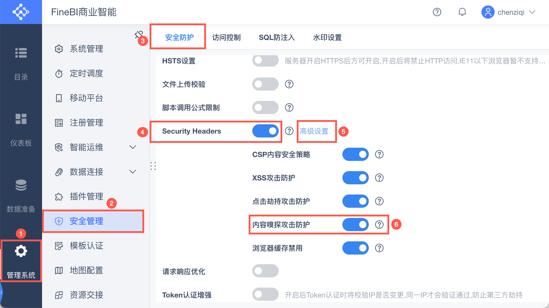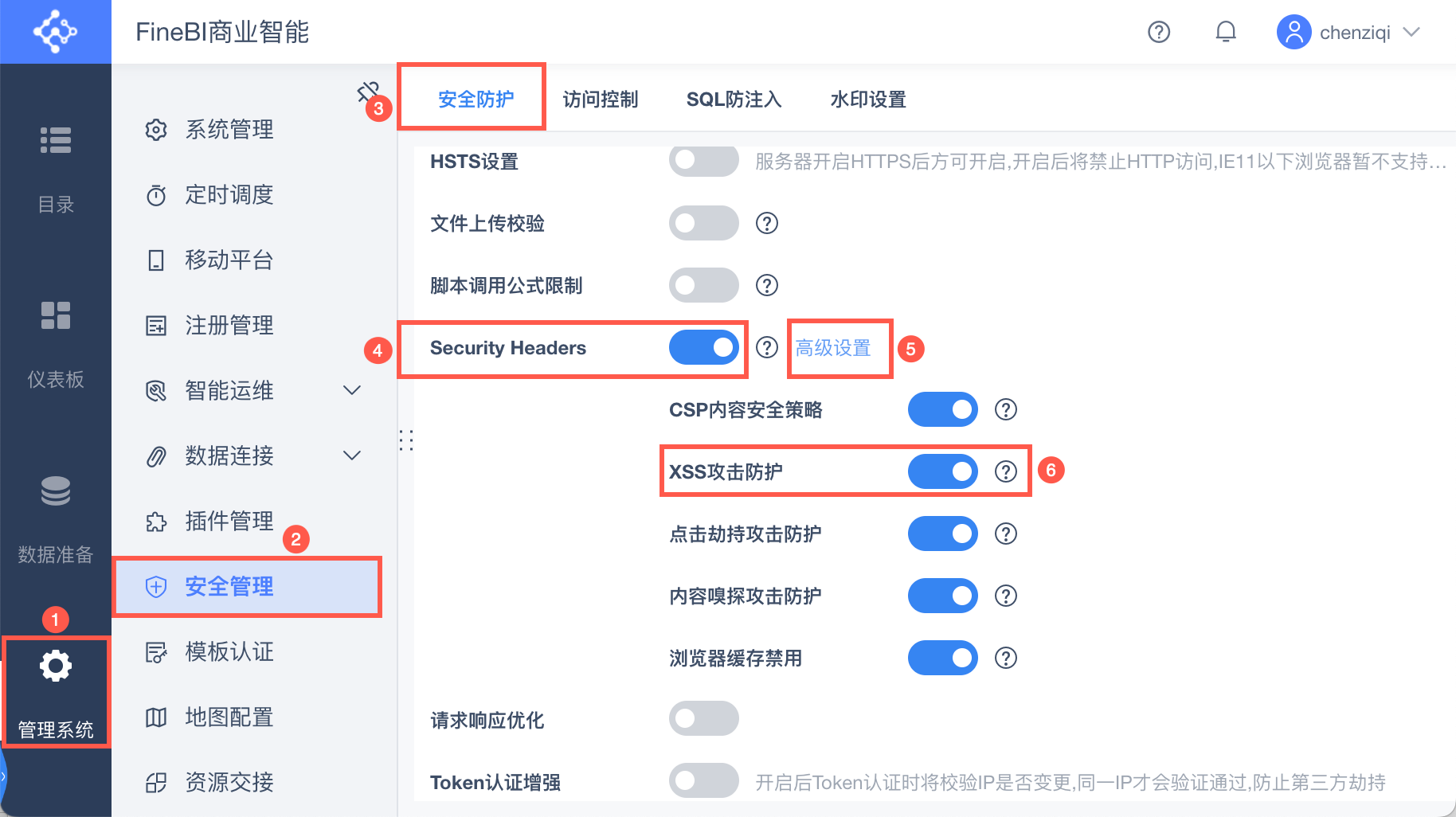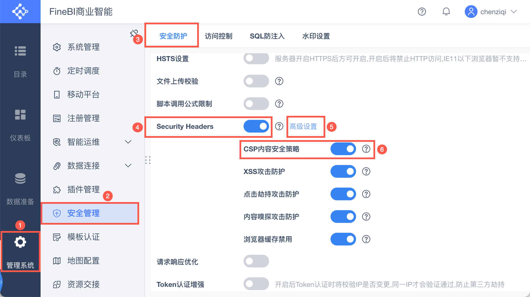 管理员登录 FineBI 系统,点击「管理系统>安全管理>安全防护」,开启「Security Headers 」功能。点击「高级设置」,即可开启「CSP 内容安全策略」。如下图所示: