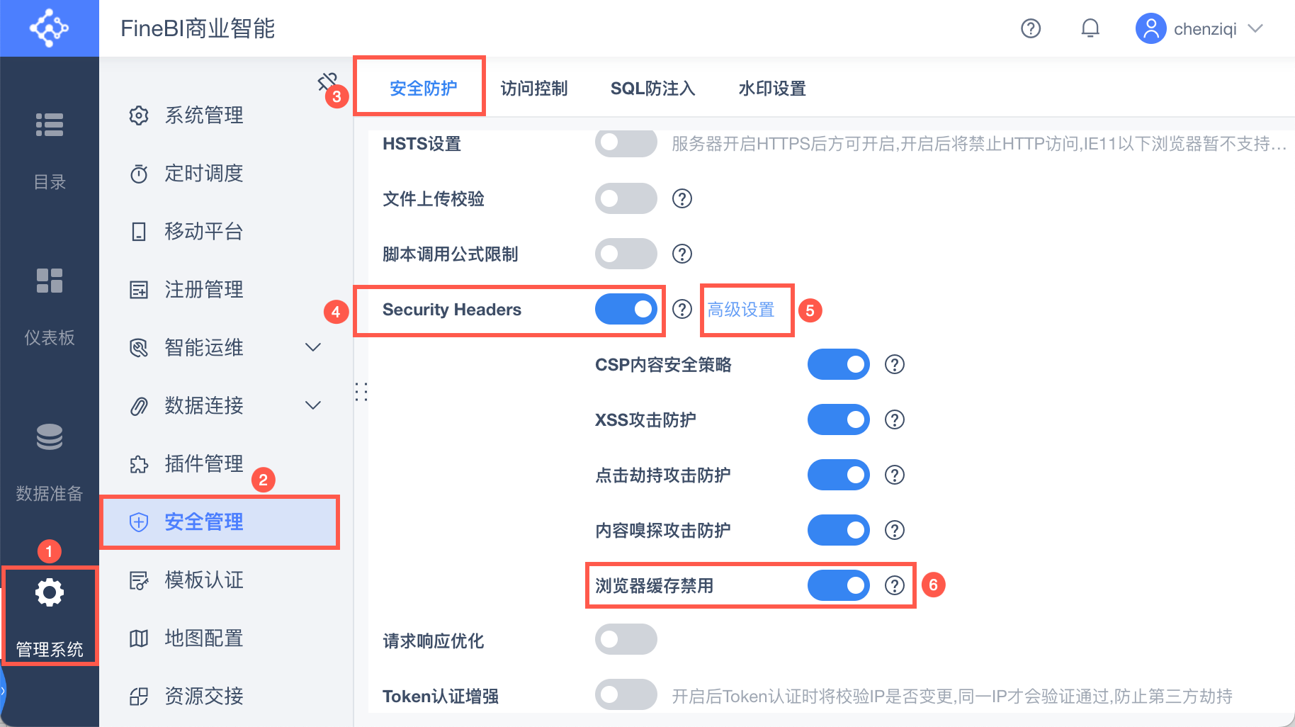 管理员登录 FineBI 系统,点击「管理系统>安全管理>安全防护」,开启「Security Headers 」功能。点击「高级设置」,即可开启「浏览器缓存禁用」。如下图所示: