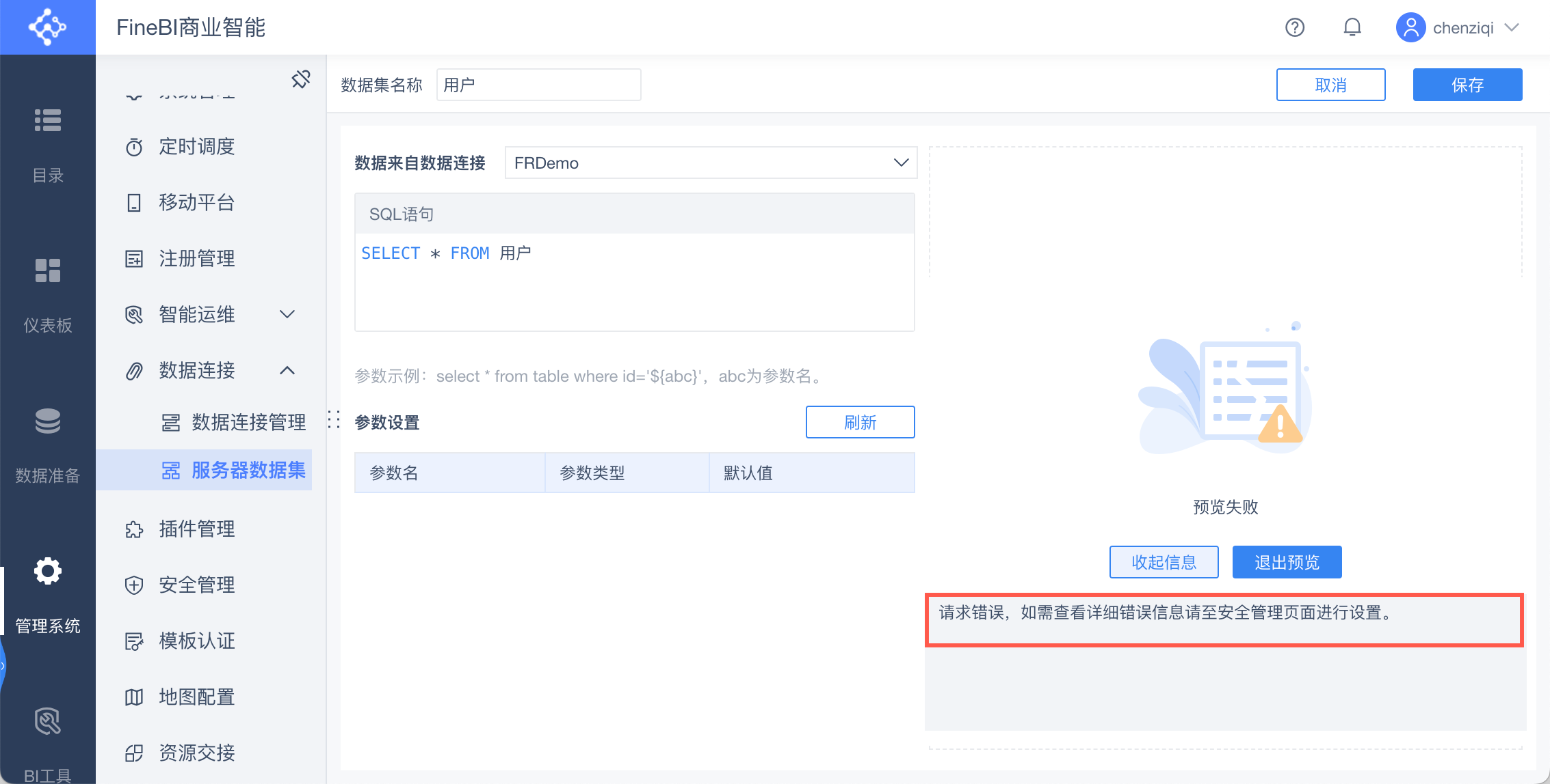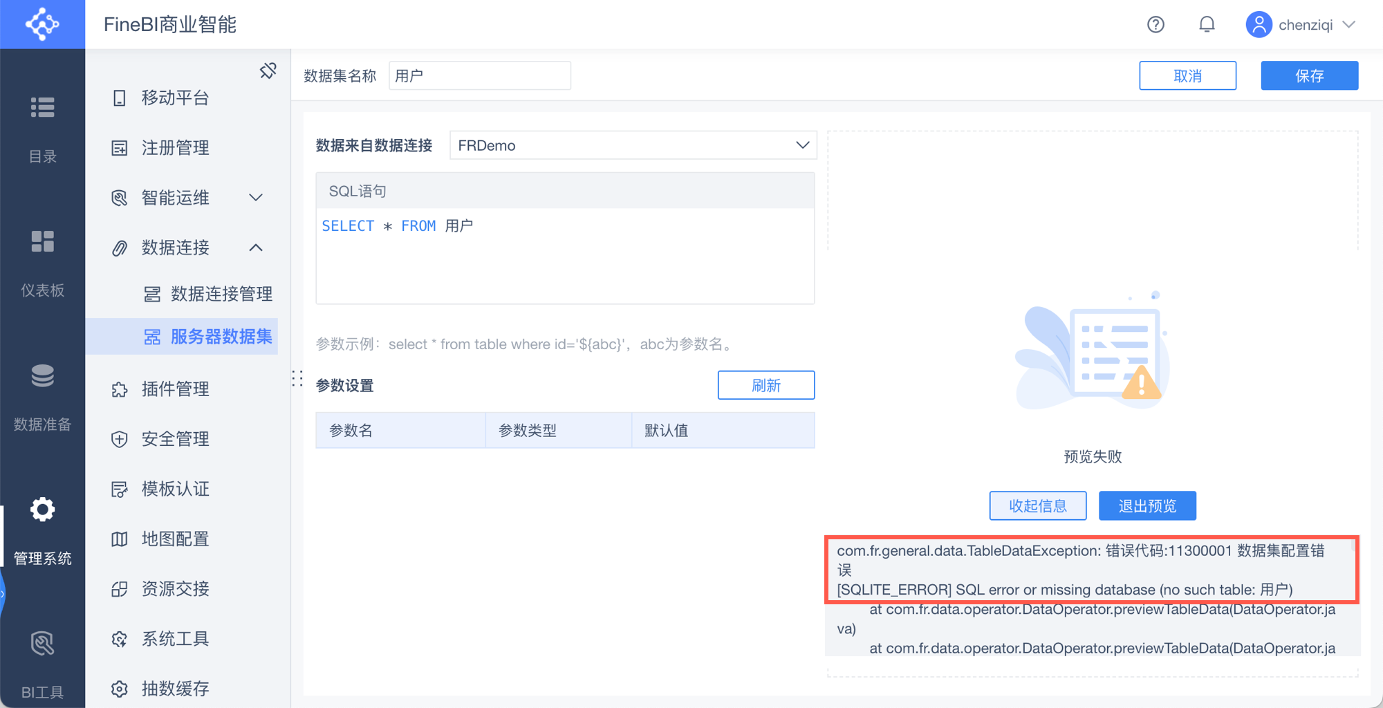 示例:在 FineBI 系统添加一个 SQL 数据集,当使用一张不存在的数据表「用户」时,预览失败,点击「详细信息」查看预览失败原因。