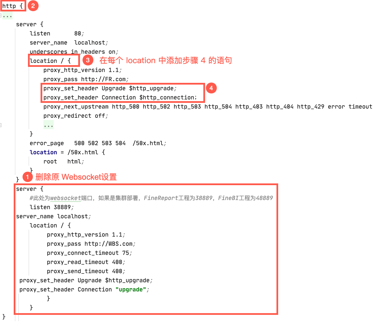 若出现以上内容,即曾在 Nginx 中配置过 WebSocket,需要删除以上内容,修改 http 配置,在每个 location 块下添加以下语句:
