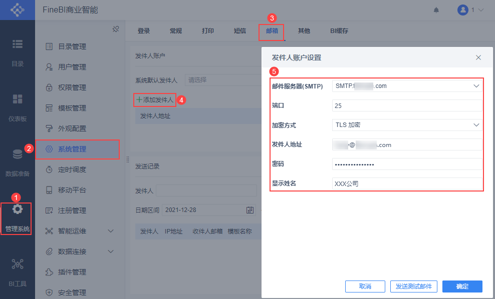 管理员登录FineBI系统,点击「管理系统>系统管理>邮箱」,添加发件人,点击「确定」,如下图所示: