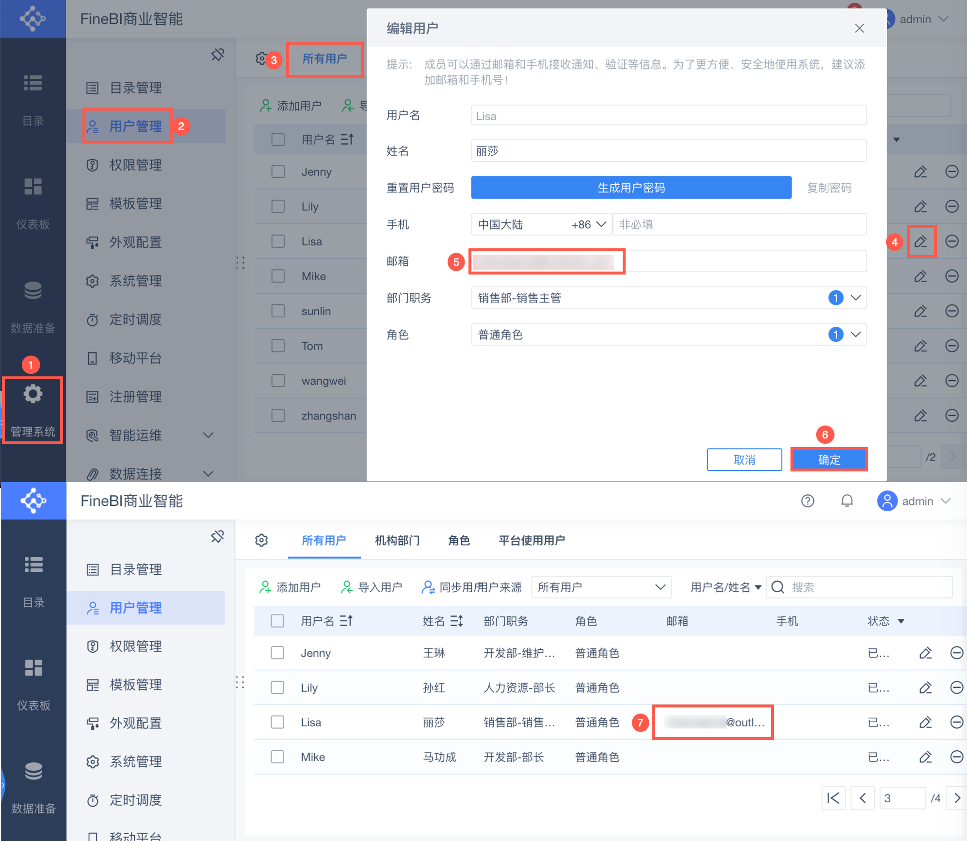 管理员登录FineBI系统,点击「管理系统>用户管理>所有用户」,编辑销售主管 Lisa 的用户信息,填入邮箱信息,点击「确定」。如下图所示: