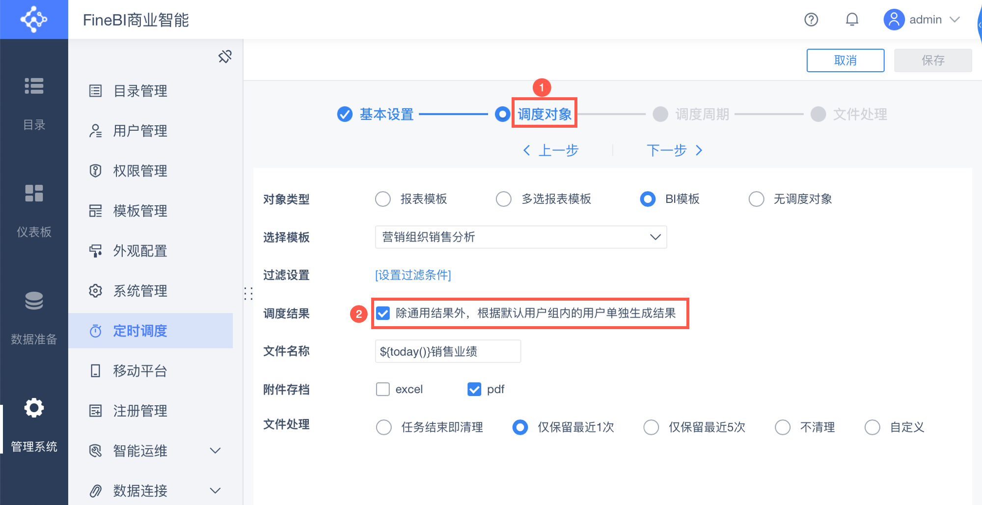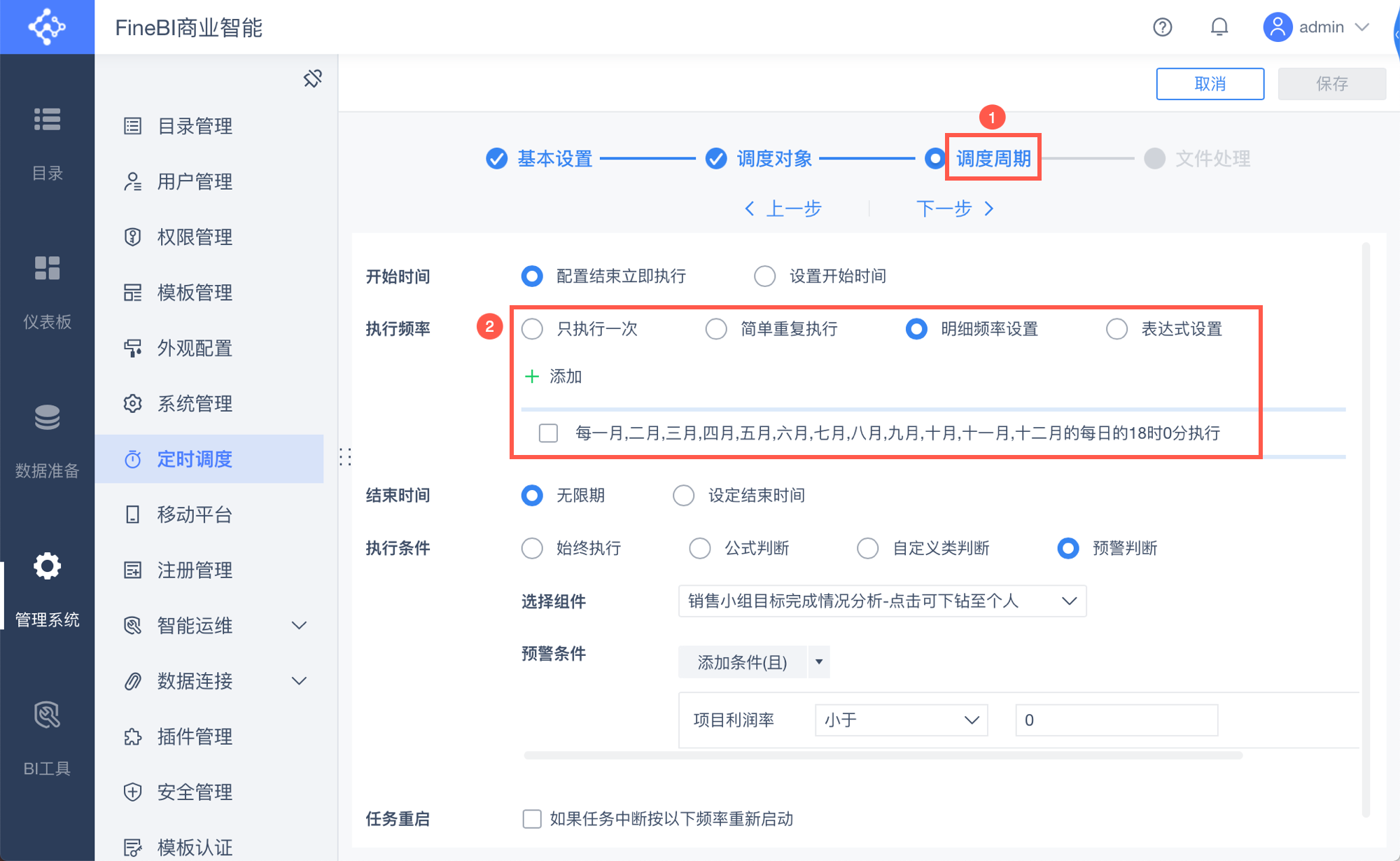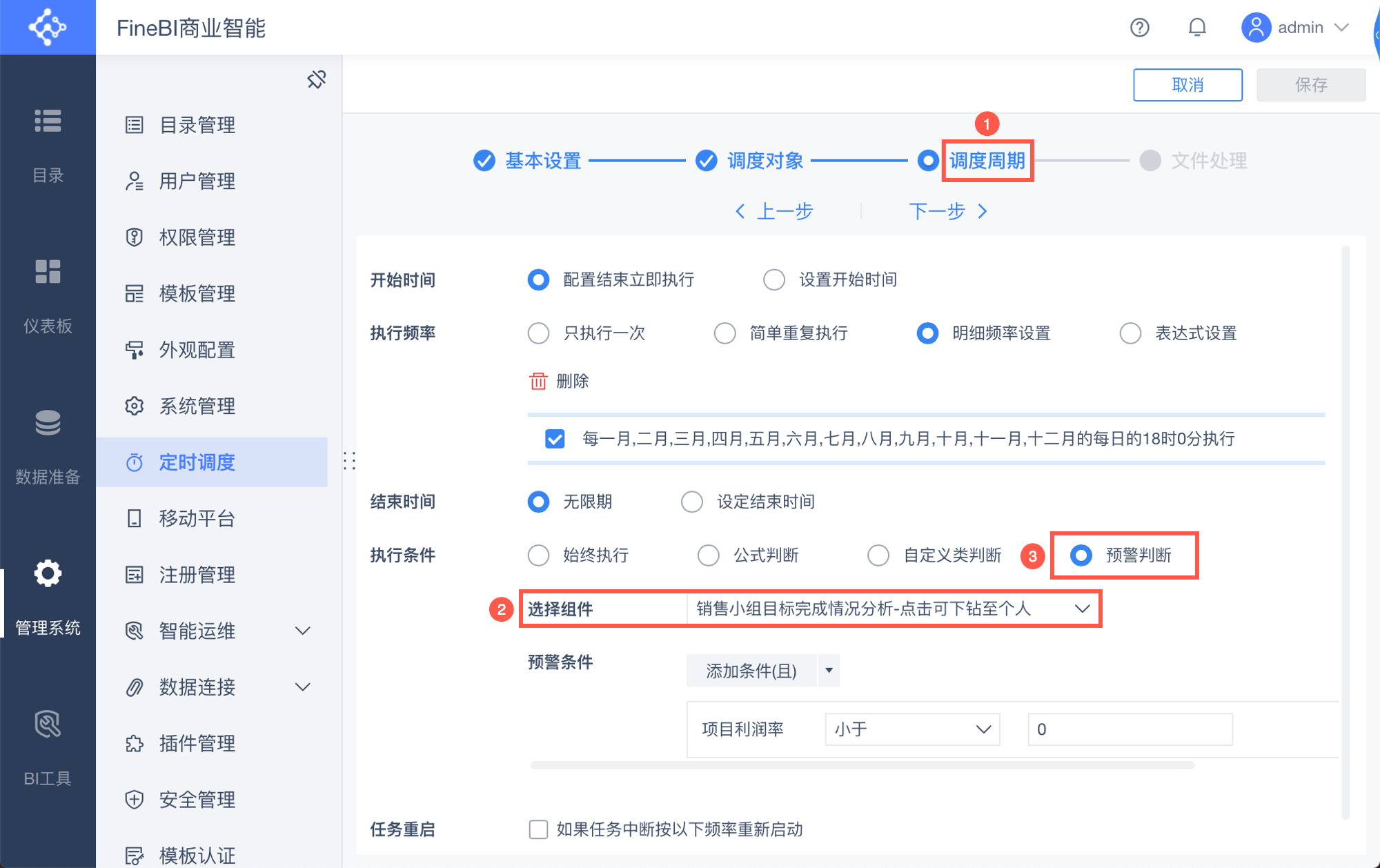 定时调度的「调度对象>对象类型」,必须选择「BI模板」,否则无法设置「预警判断」任务。