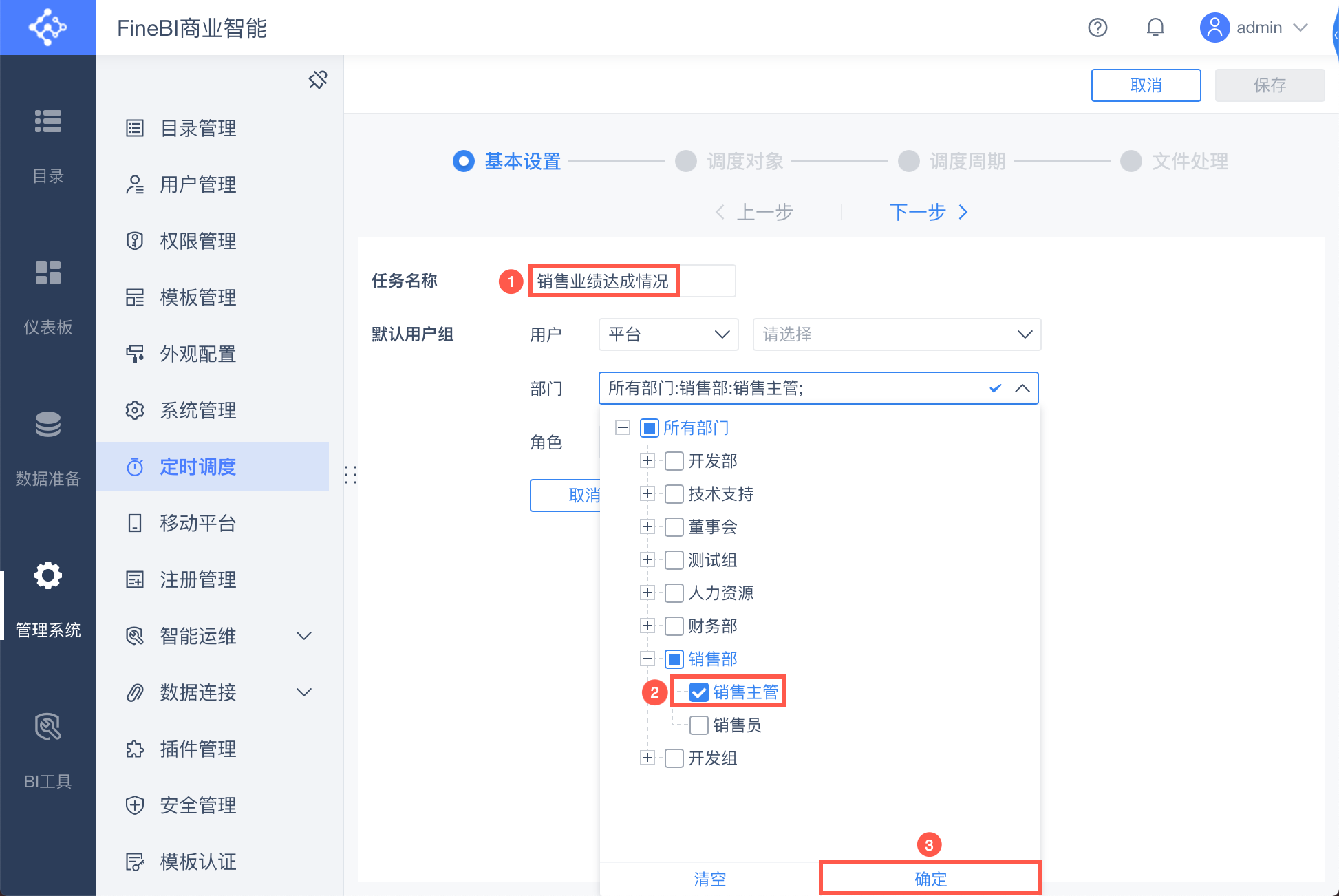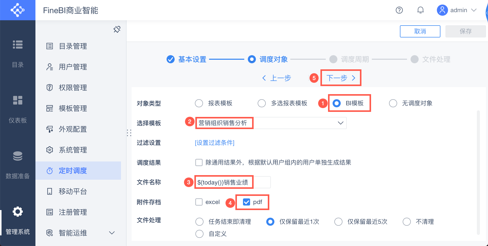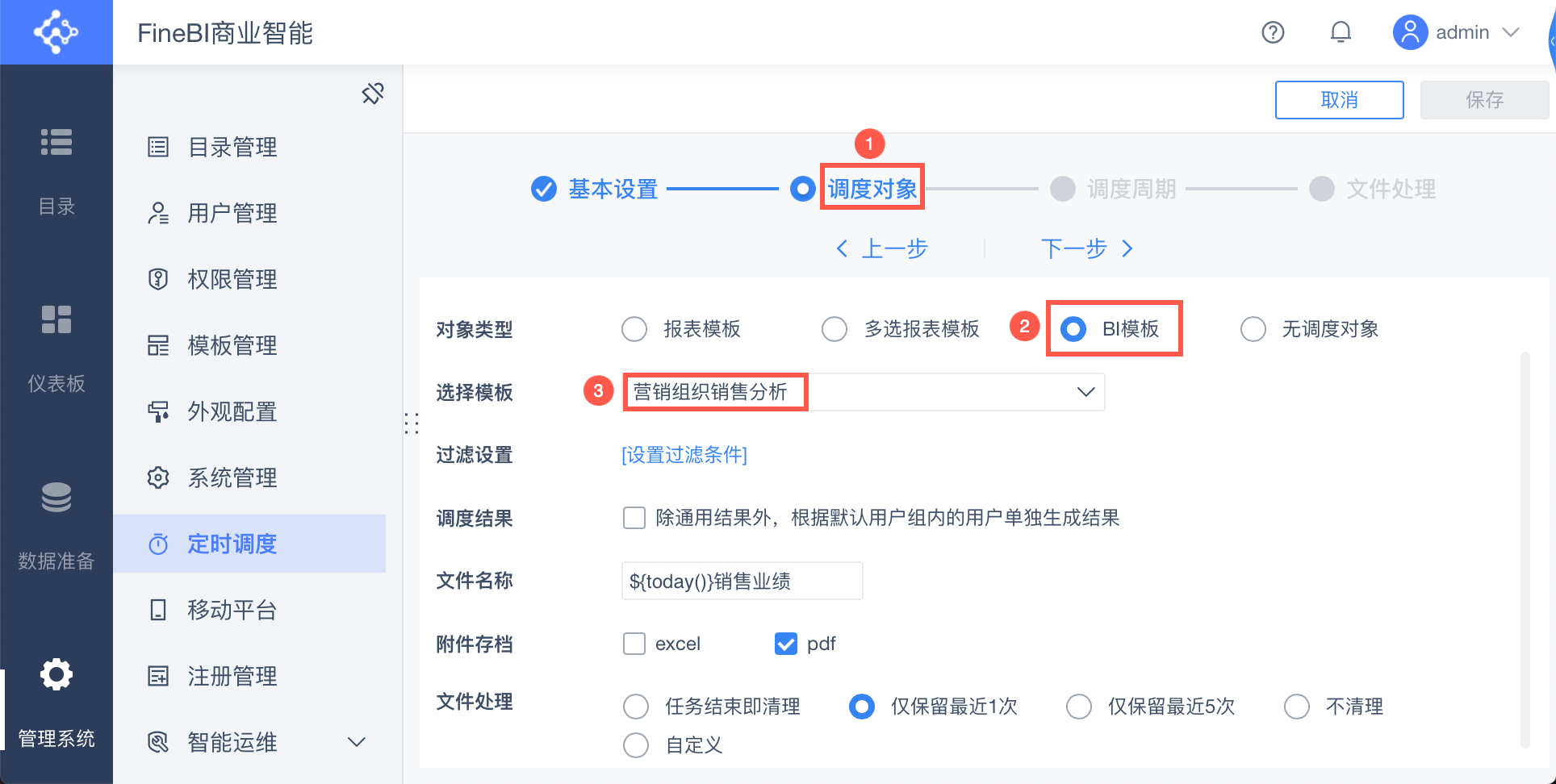 定时调度的「调度对象>对象类型」,必须选择「BI模板」,否则无法设置「预警判断」任务。
