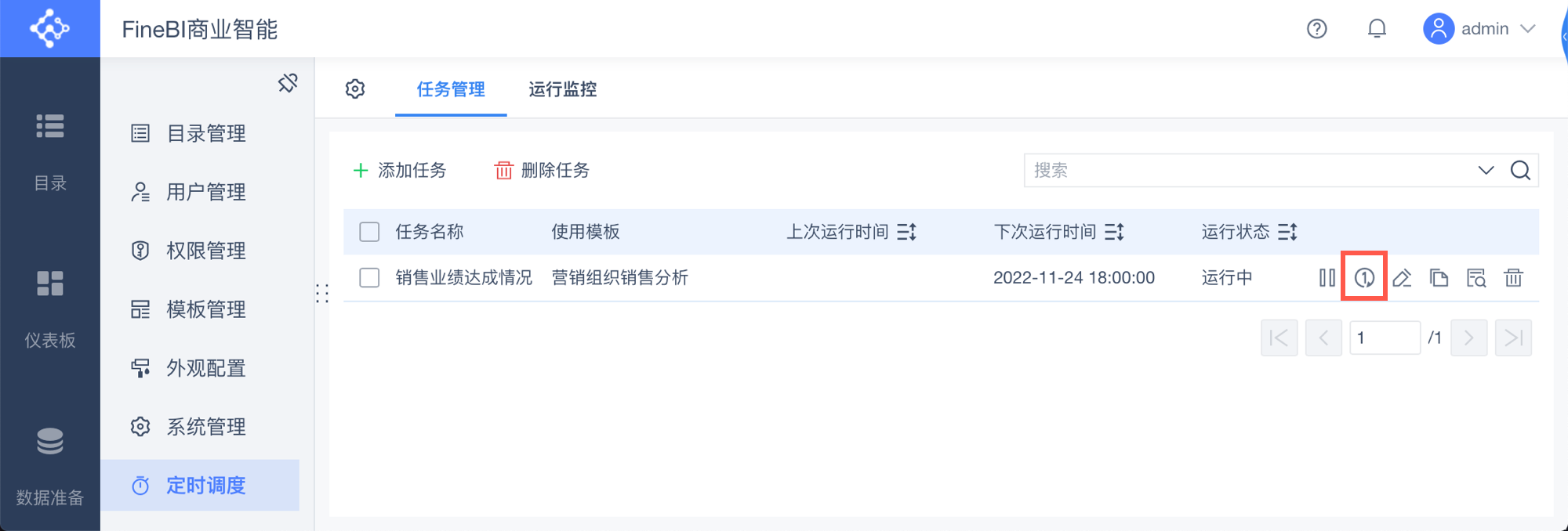 管理员登录FineBI系统,点击「管理系统>定时调度>任务管理」,点击「添加任务」,添加一个定时调度任务。如下图所示: