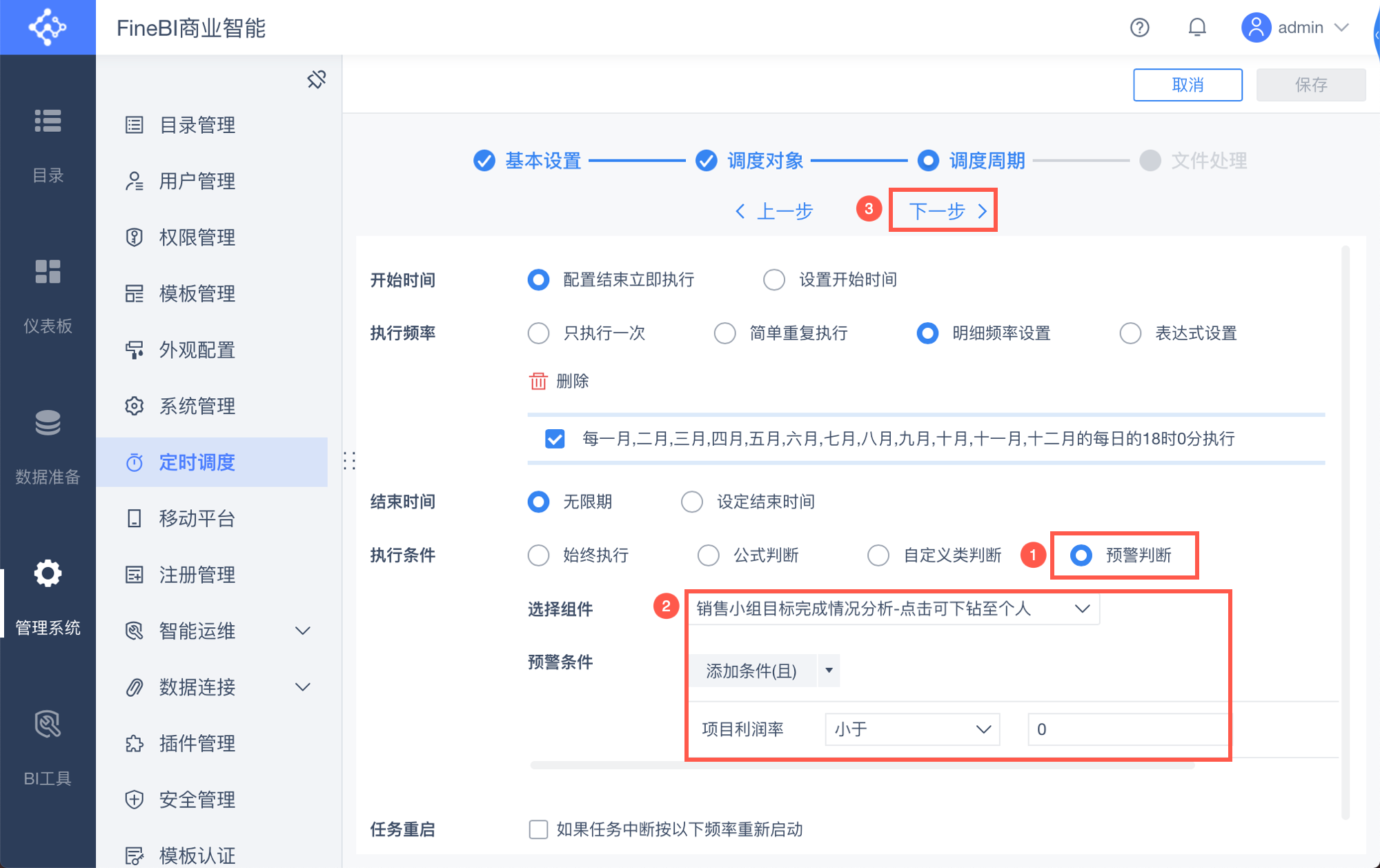 设置定时调度任务,每天晚上18时,检查组件「销售小组目标完成情况分析」中是否存在项目利润率低于0,若低于0就要通过邮件通知销售部销售主管。