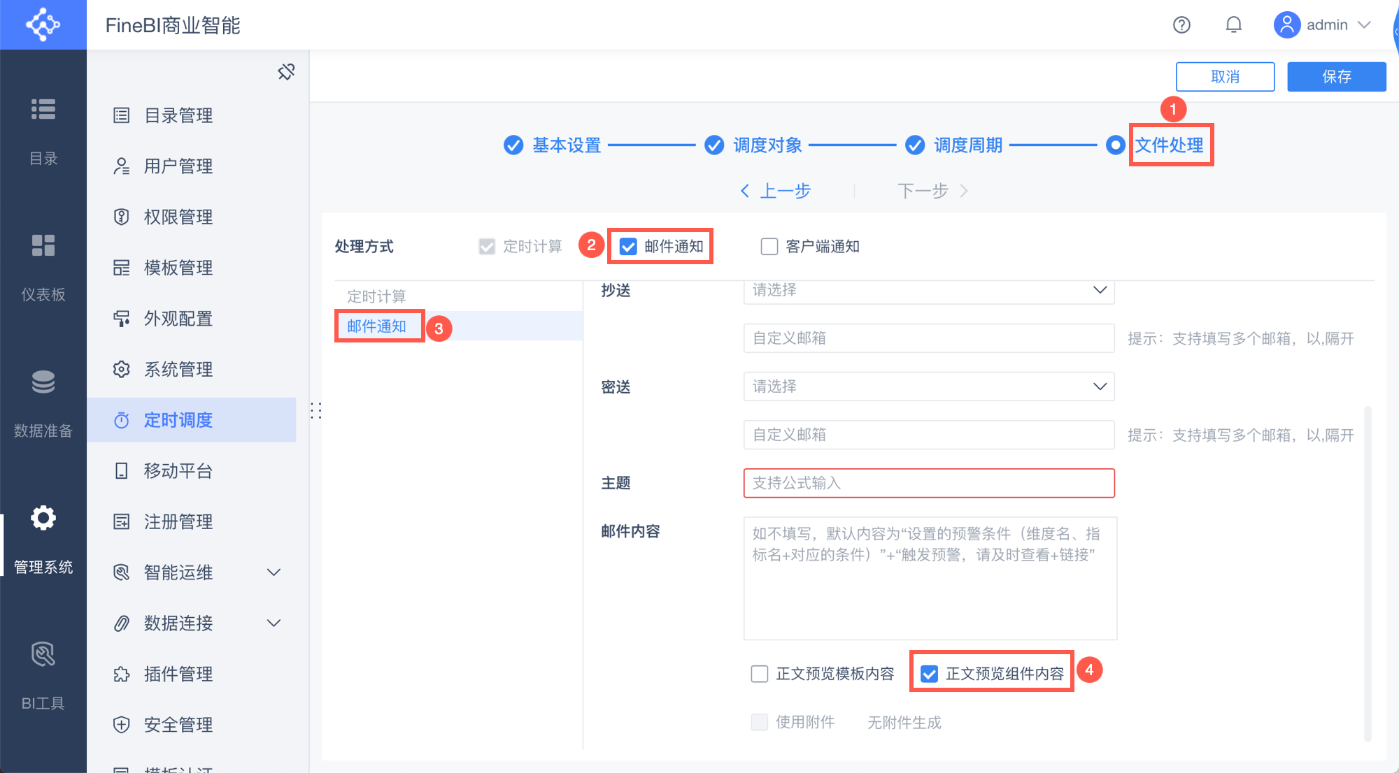 若定时调度任务配置了「预警判断」,在「文件处理>邮件通知>邮件内容」中,新增「正文预览组件内容」选项。